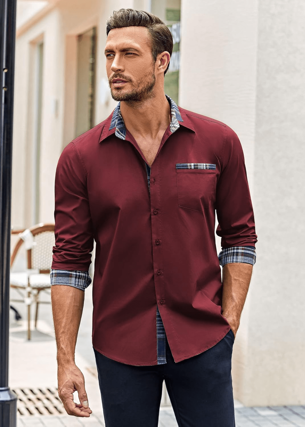 Design: Button-down with plaid collar and chest pocket