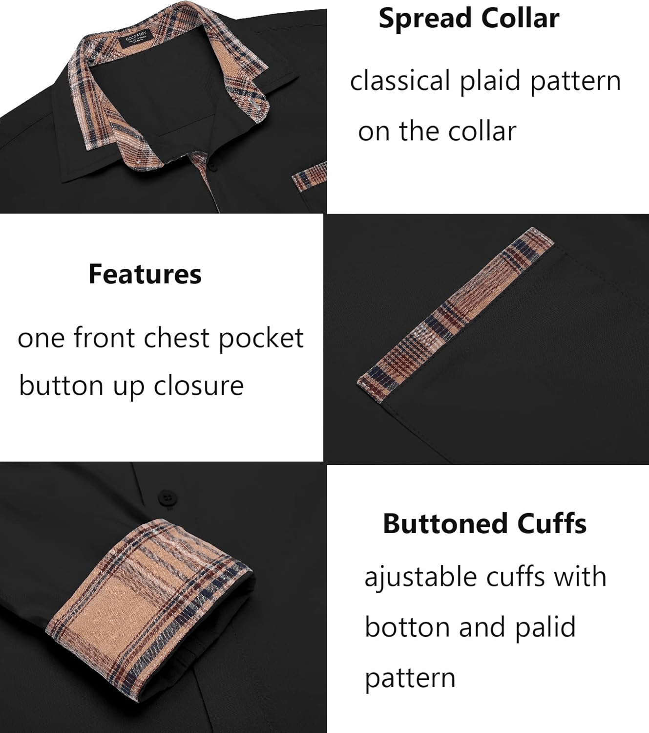 • Collar: Button-down spread collar with plaid trim