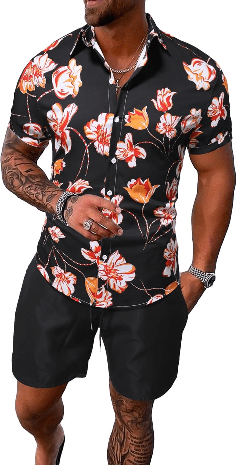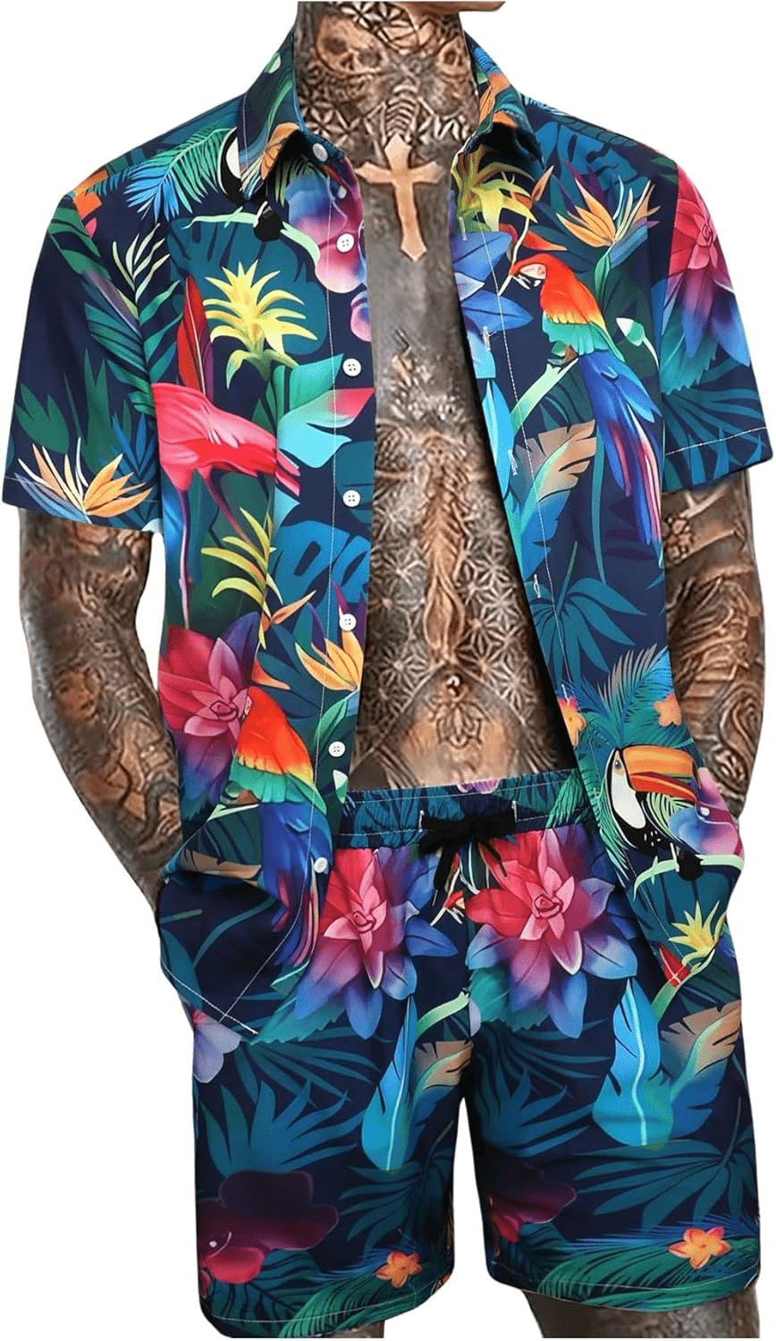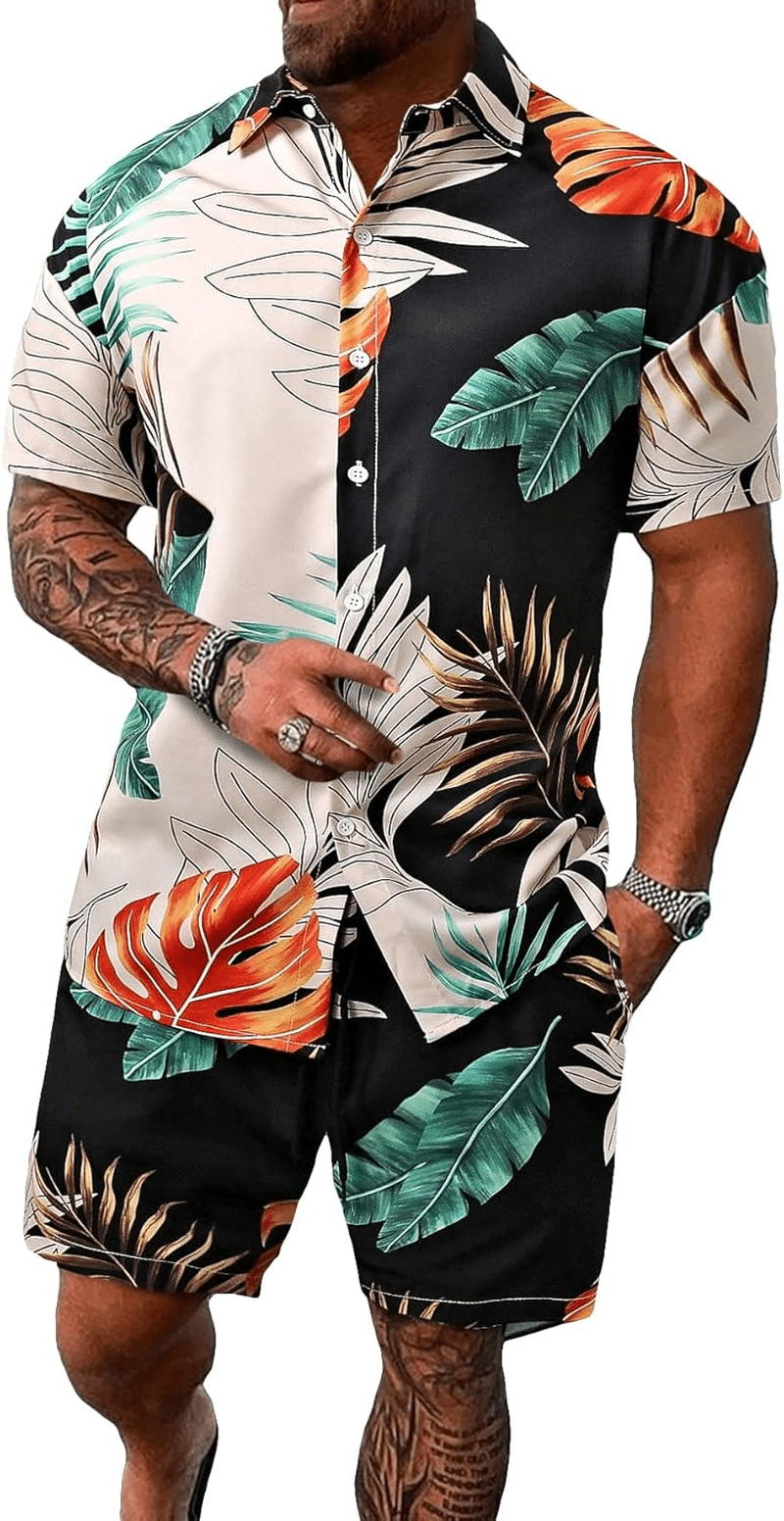 Men’S Vacation Beach Outfits 2 Piece Shorts Set Floral Hawaiian Button down Shirt and Shorts
