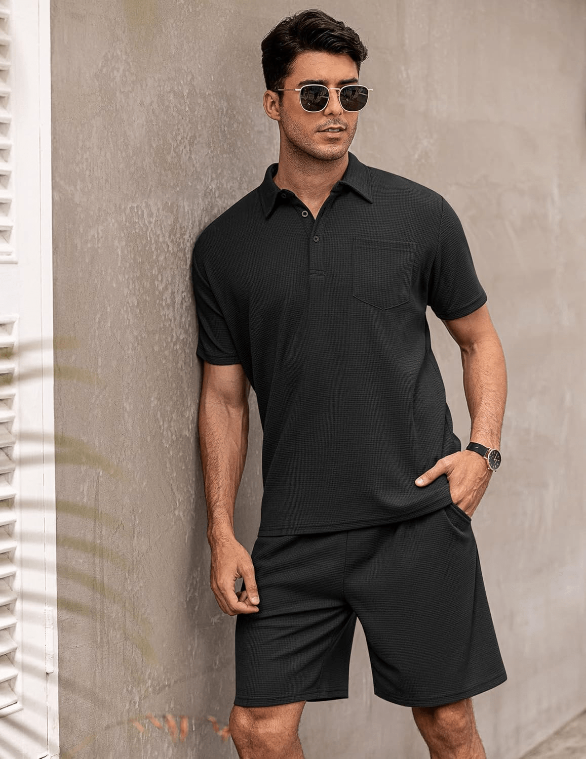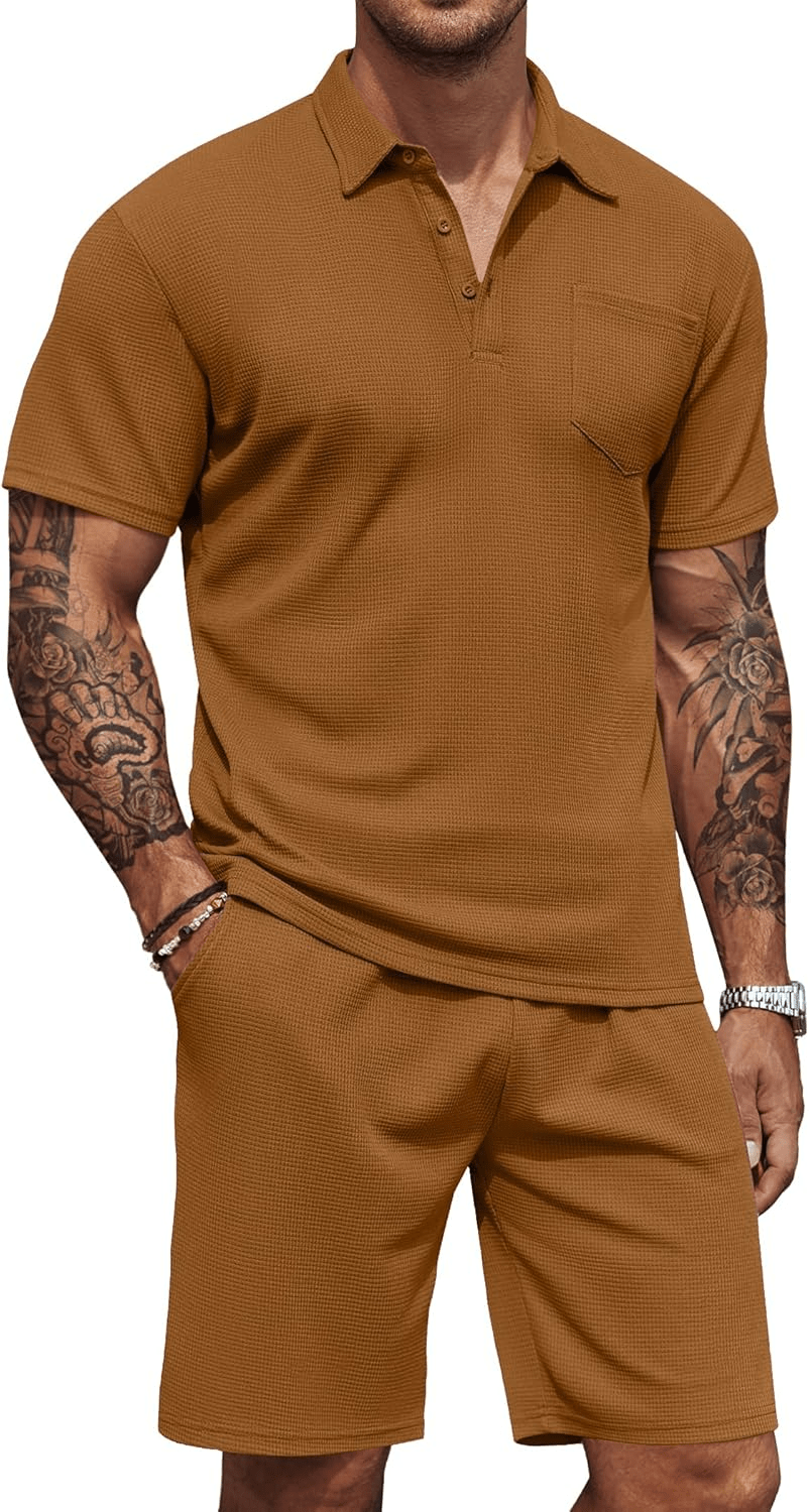 Men’S Waffle Knit Polo Shirt and Shorts Set 2 Pieces Outfits Summer Suit Casual Tracksuit with Pockets