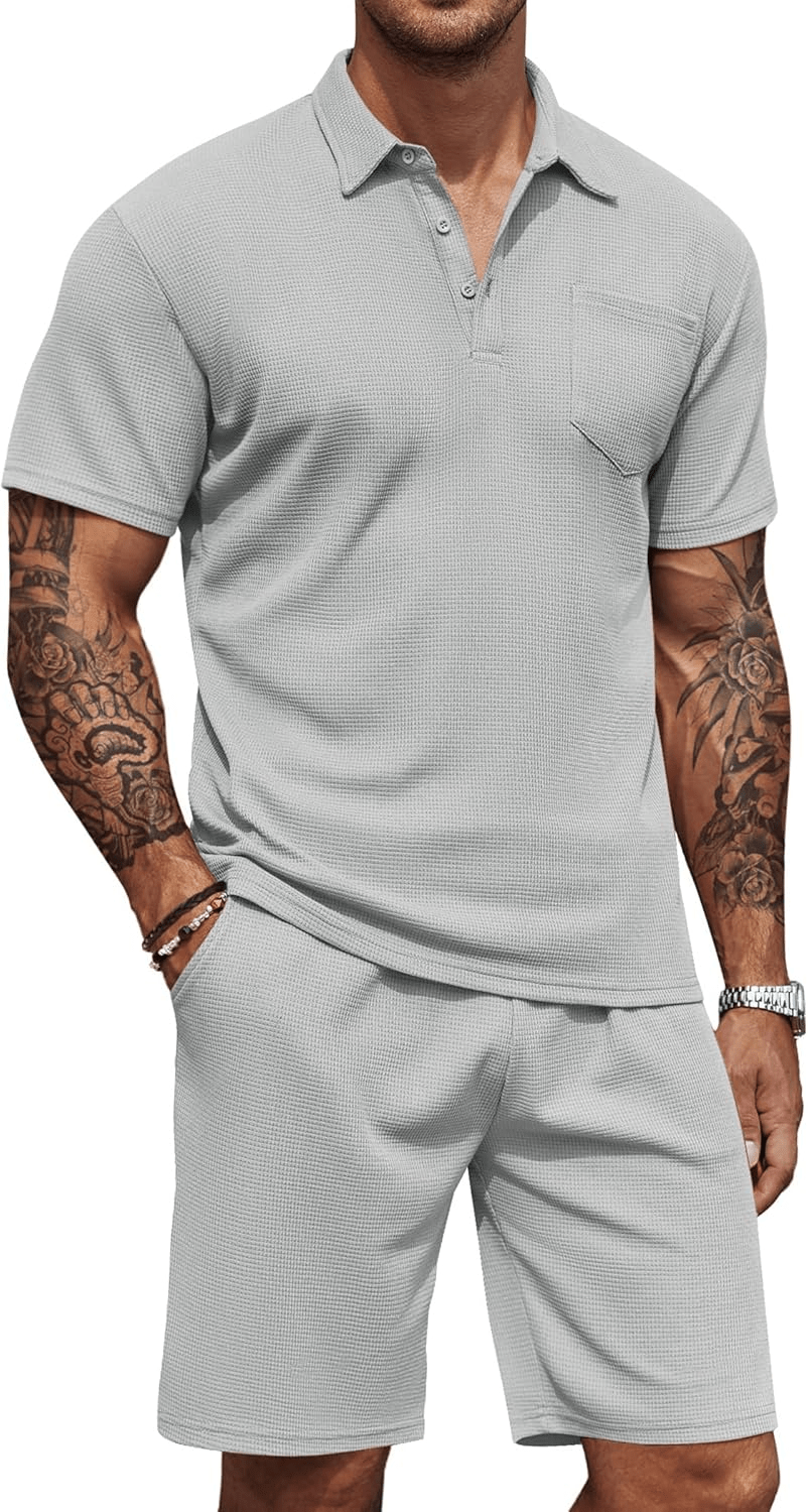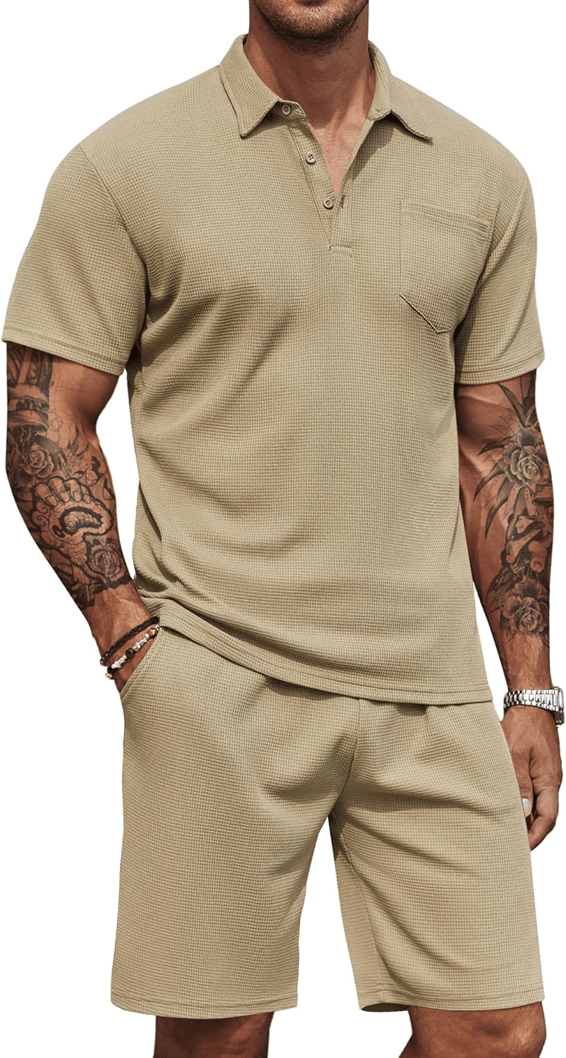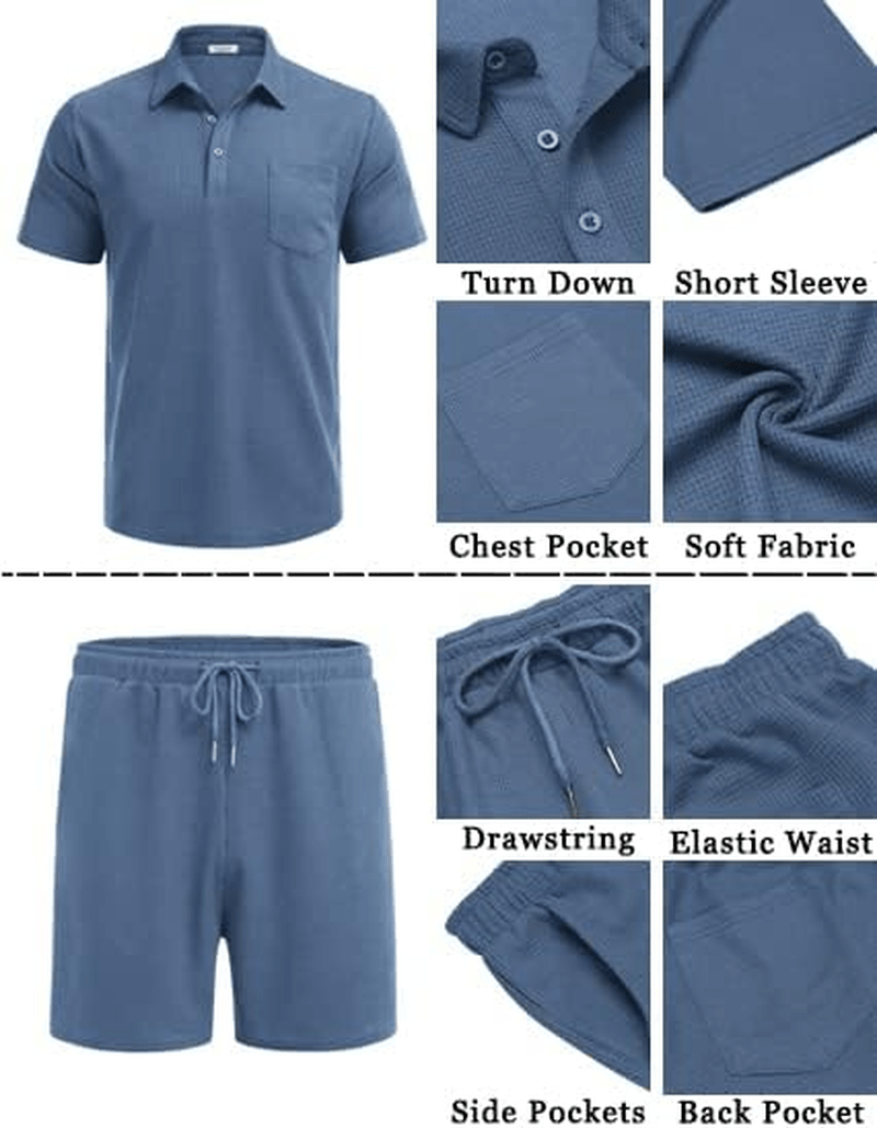 Men’S Waffle Knit Polo Shirt and Shorts Set 2 Pieces Outfits Summer Suit Casual Tracksuit with Pockets