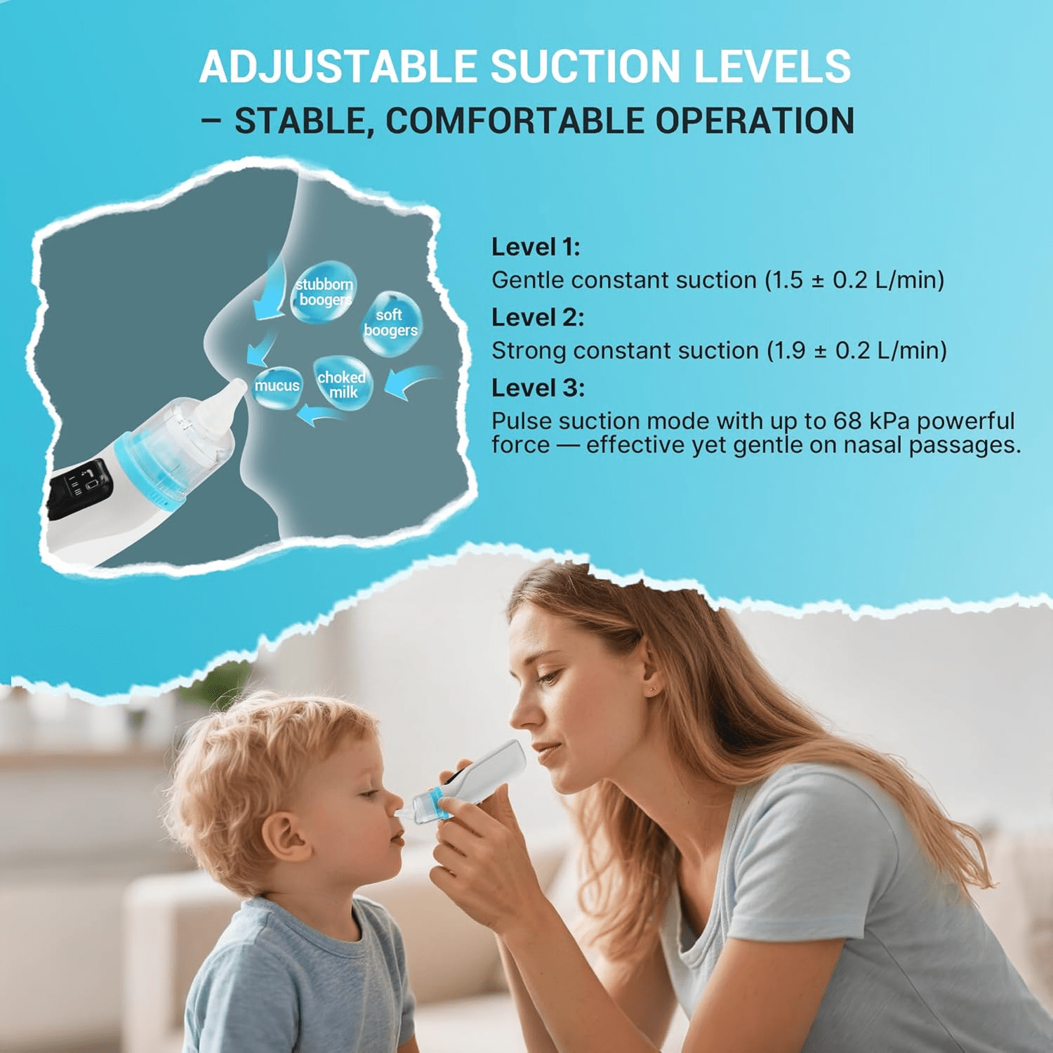 • 3 Suction Modes with Constant & Pulsed Power – Features three adjustable levels with stable suction output. The combination of constant force and pulsed technology ensures high-efficiency mucus removal while staying gentle on your baby’s delicate nasal passages.