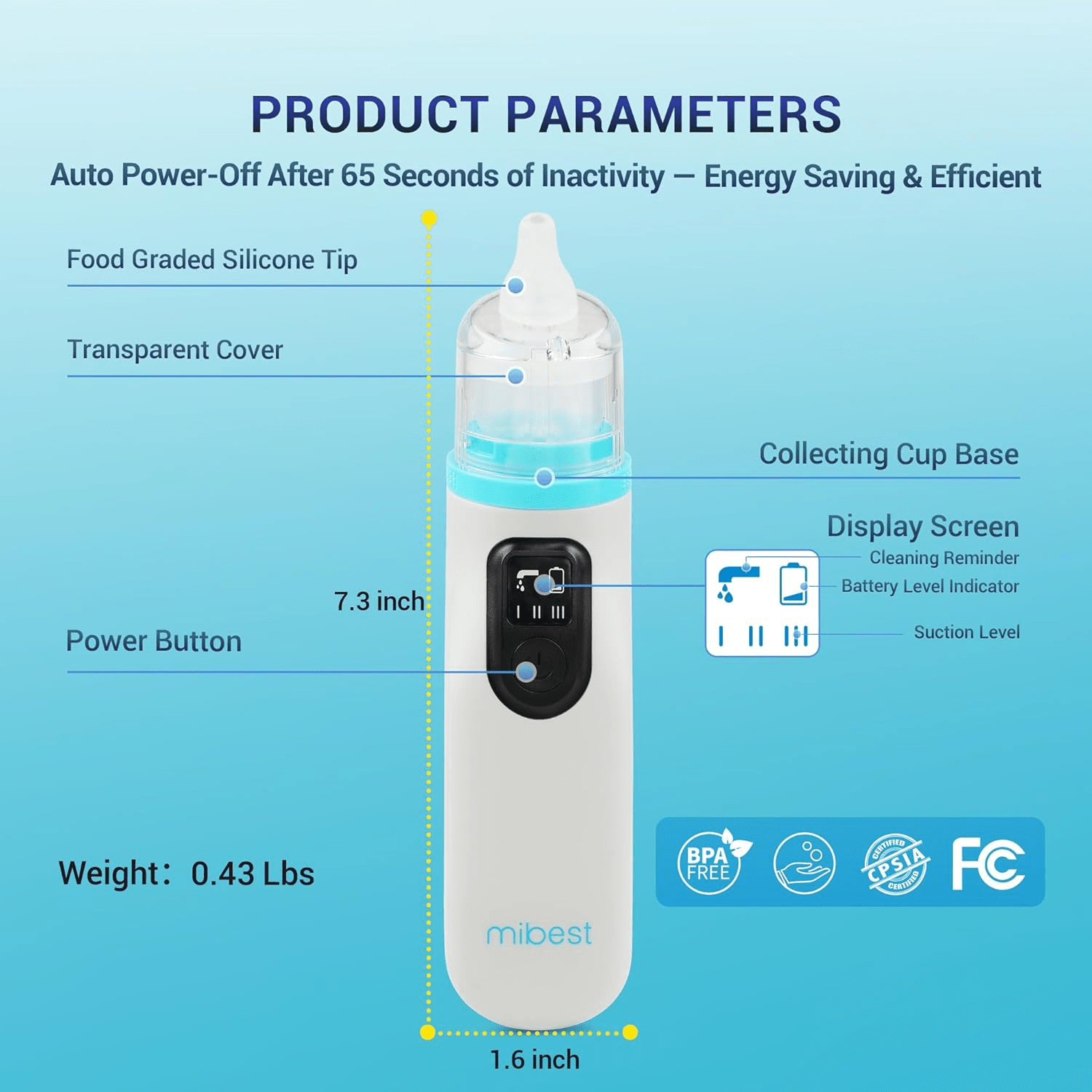 • Smart Sensor & Global Anti-backflow Patent – Built-in intelligent sensor activates suction only when needed. The globally patented anti-backflow system prevents mucus from flowing back, protecting the motor and keeping the device hygienic.