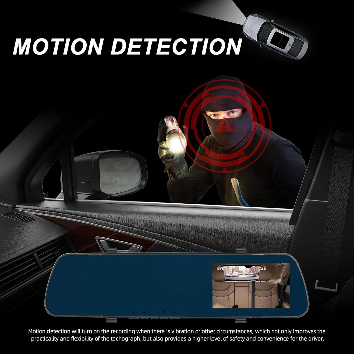 - 【Enhanced Security with Motion Detection & Loop Recording】 Our mirror dash cam boasts intelligent motion detection that activates recording upon sensing vibration, providing you with an additional layer of security. Additionally, it features loop recording capabilities; once the storage is full, the device will automatically overwrite old videos, ensuring continuous recording without the hassle of manual management.