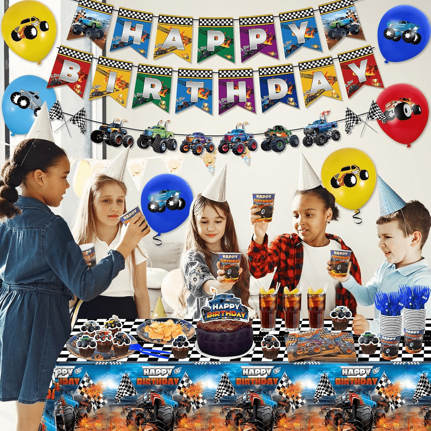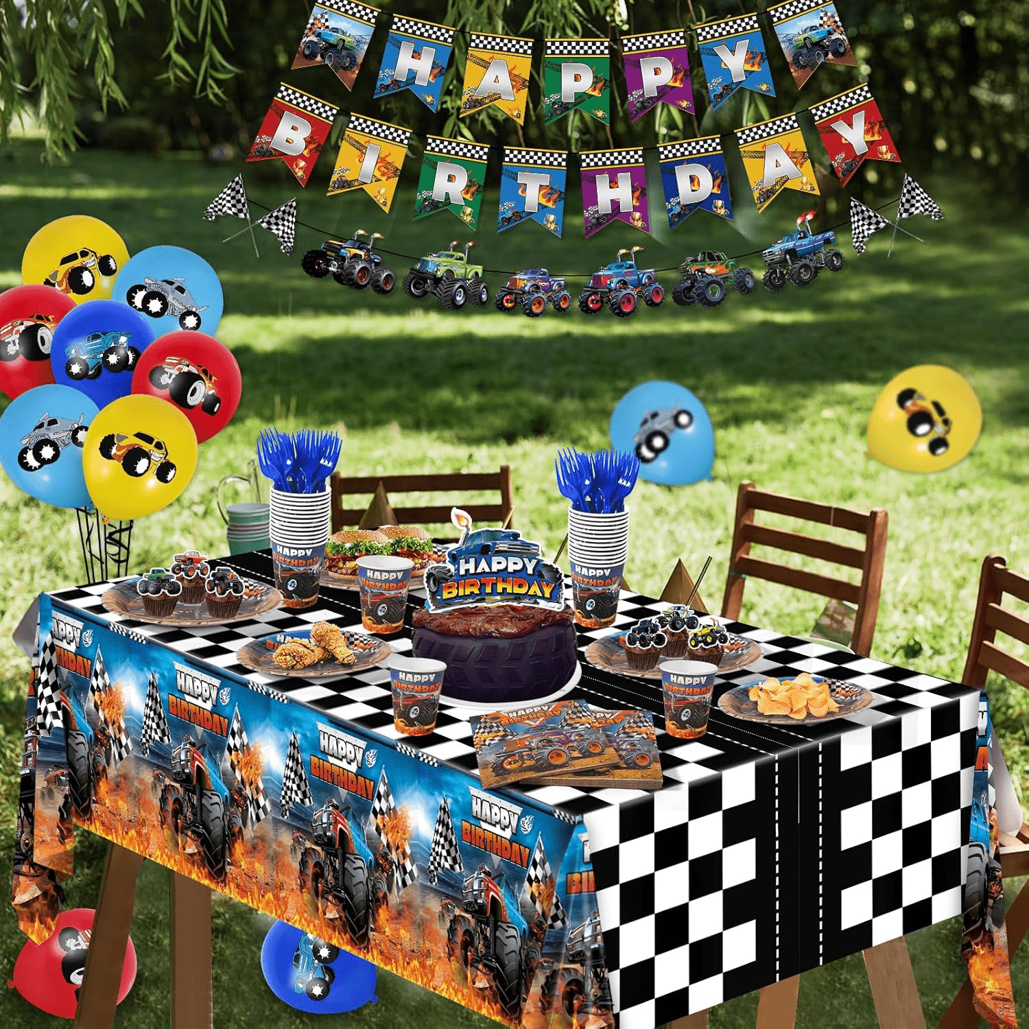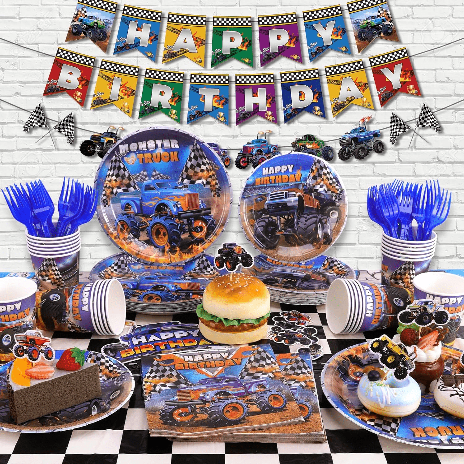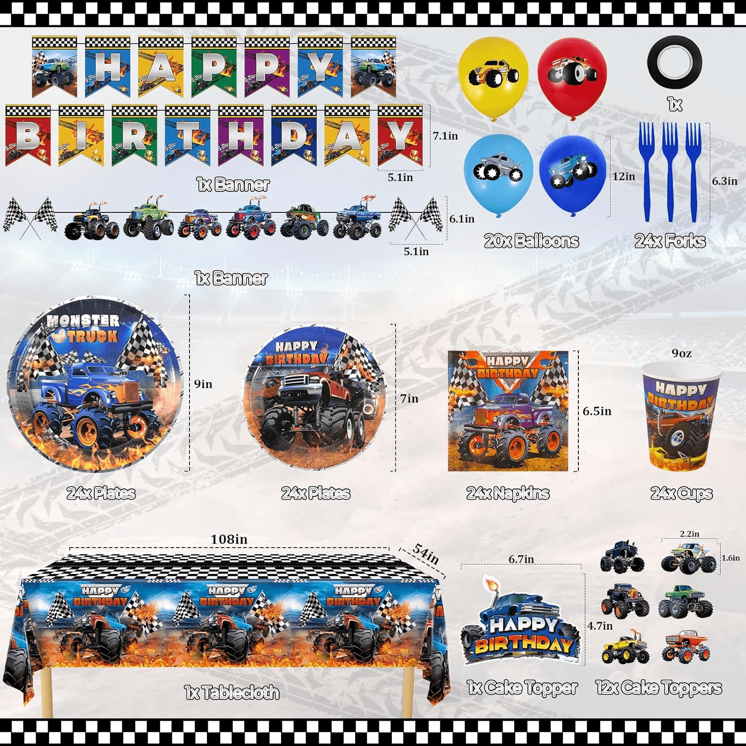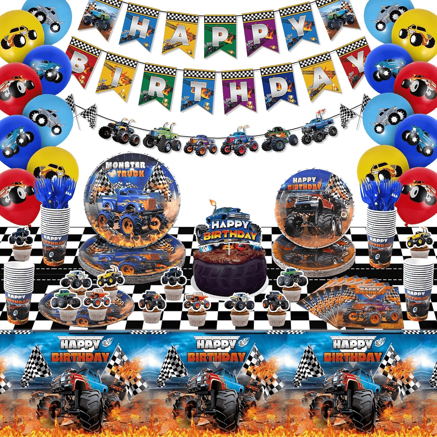 - Valuable Truck Tableware – This Monster Truck Party Tableware Set includes 1pc party tablecloths, 1pc happy birthday banner, 1pc truck banner, 1pc cake topper, 12pcs cupcake toppers, 12pcs latex balloons, 24pcs 9” plates, 24pcs 7” plates, 24pcs 9oz cups, 24pcs 6.5” napkins, 24pcs forks. Adequate quantities and complete sets will meet most of your party decorating needs.