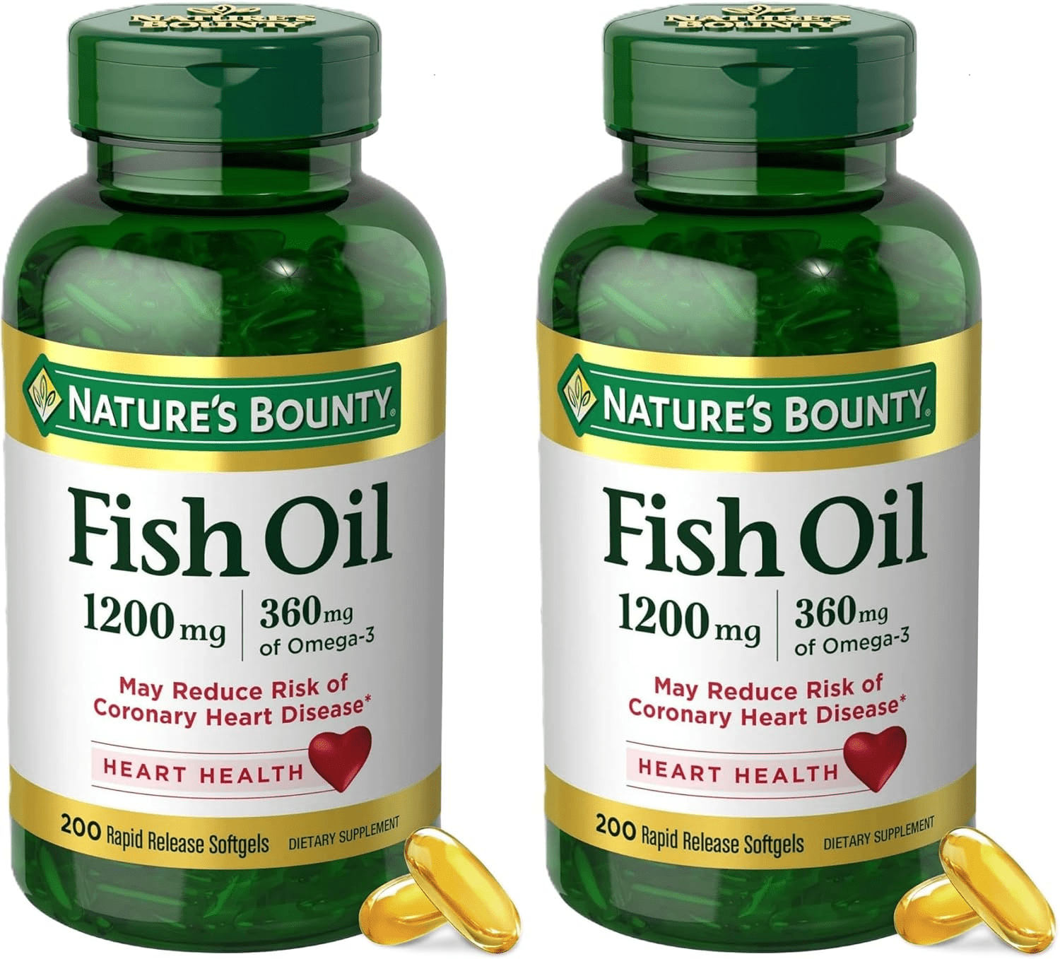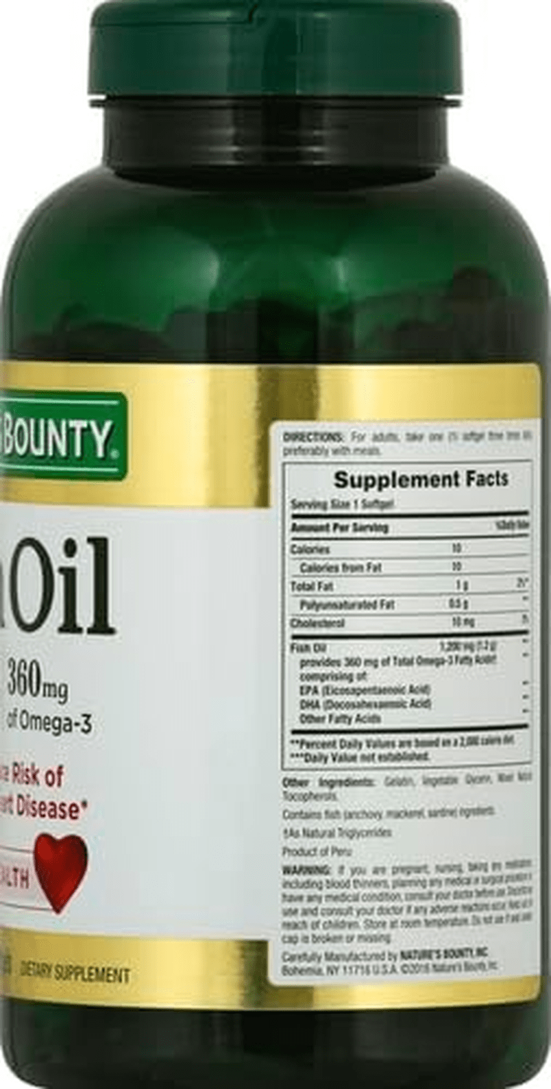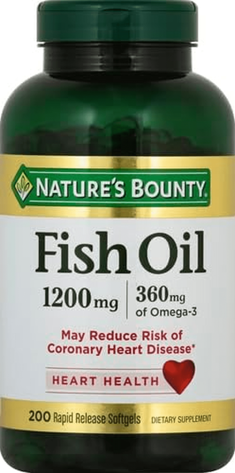 - Nature’s Bounty Fish Oil Omega 3 Supplements are designed to promote heart health and overall wellness through their potent formulation. Each softgel contains 1200 mg of fish oil, delivering 360 mg of omega-3 fatty acids per serving, which are essential for supporting cardiovascular health. These supplements are an excellent choice for individuals looking to enhance their heart function and maintain a healthy lifestyle. Simply incorporate them into your daily routine for optimal benefits, whether taken with meals or as a standalone supplement.
