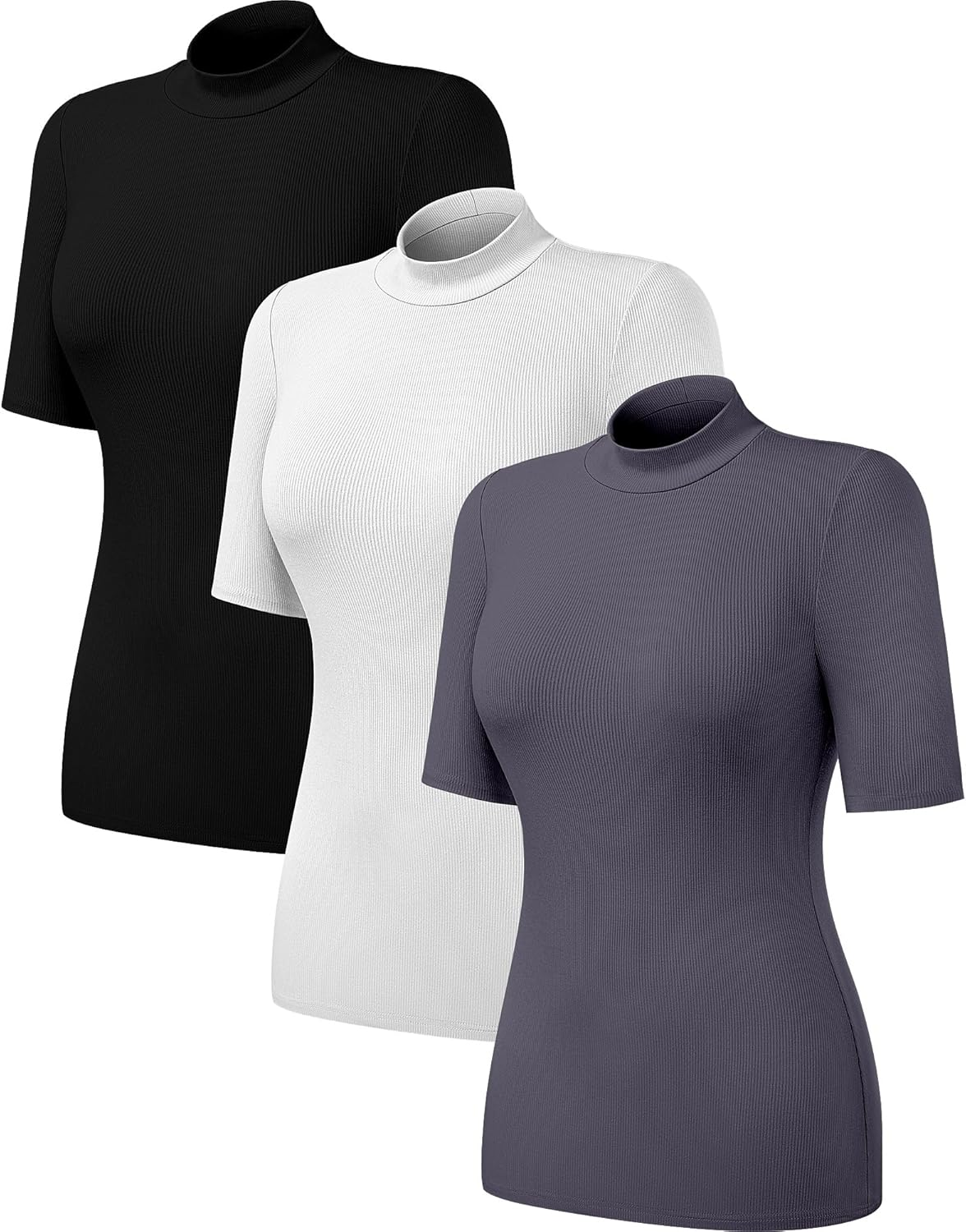 Neer 3 Pack Women’S Half Sleeve T-Shirts, Mock Turtleneck Elbow Length Tee Ribbed Slim Fit Casual Summer Tunic Tops