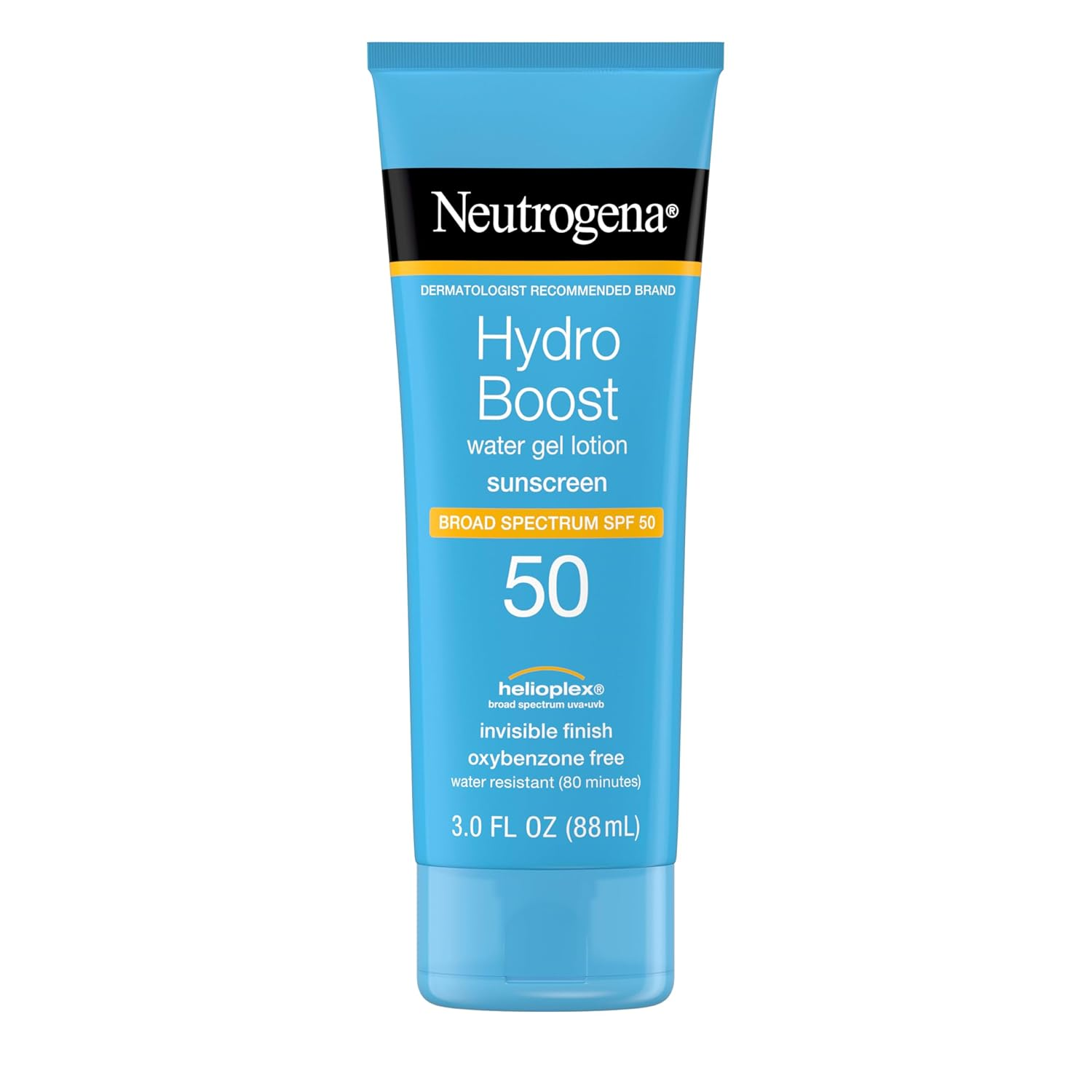 - Experience top-tier sun protection with Neutrogena Hydro Boost Moisturizing Water Gel Sunscreen Lotion, offering Broad Spectrum SPF 50 in a convenient 3 pack. Infused with advanced Helioplex technology, this lotion is specifically formulated to shield your skin from harmful UVA and UVB rays whilst keeping it hydrated. For optimal use, incorporate it into your daily skincare routine, ensuring your face and body are safeguarded when exposed to the sun.