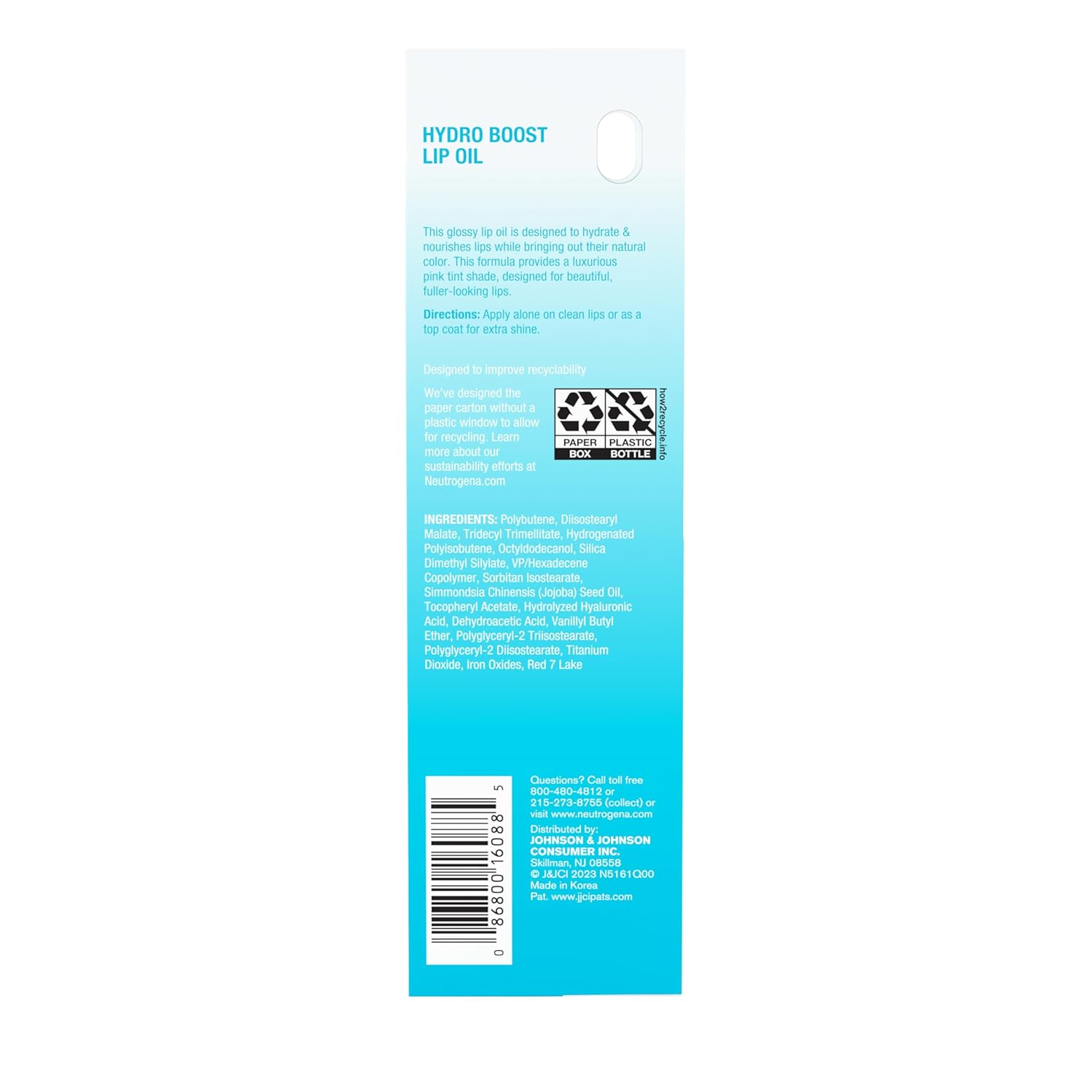 - .2-fluid ounce tube of Neutrogena Hydro Boost Lip Oil with Hyaluronic Acid, offering a glossy, hydrating lip oil in a captivating Light Pink shade that nourishes and enhances the natural beauty of your lips.