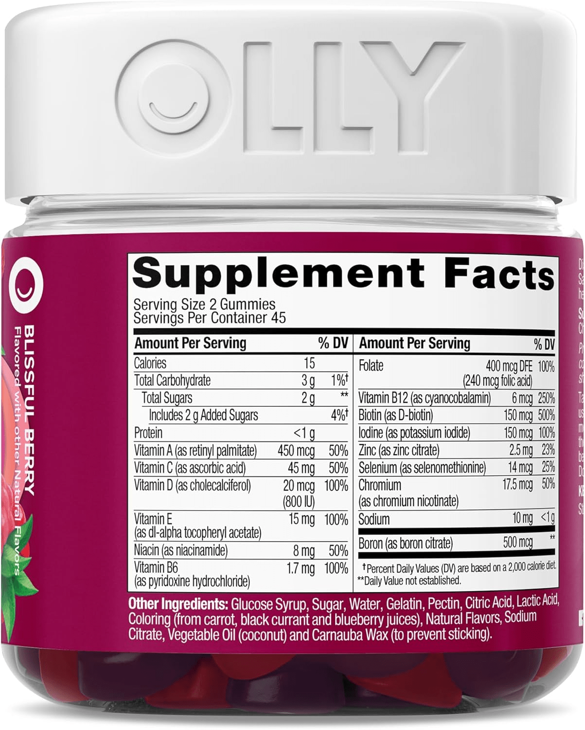Go big with OLLY Women’s Multi gummies, a delicious, scientifically formulated, gluten free gummy vitamin for health and wellness. Our Blissful Berry flavor with other natural flavors gummy vitamins for women include nutrients to nourish you daily so you can keep doing your thing. This womens multivitamin blend features B Vitamins to support cellular energy, Vitamin D to support bone health* and Vitamins A, C & E. The chewable daily vitamins are a blend for overall wellness and to help fill the gaps when your eating habits are a little less than perfect.* We’ve made it our mission to champion better wellbeing, for all. We do it by crafting products that are as effective as they are delicious—because we know when something feels good, you’re more likely to do it.* *These statements have not been evaluated by the Food and Drug Administration. This product is not intended to diagnose, treat, cure or prevent any disease.
