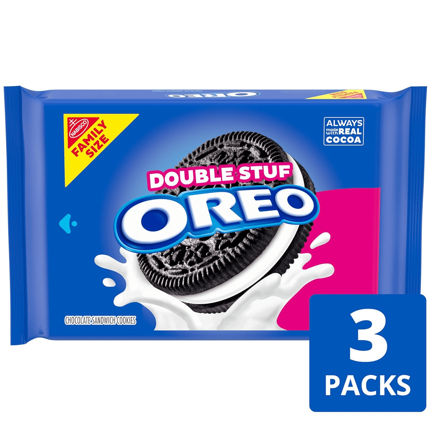 - Includes three family-sized packs of OREO Double Stuf Chocolate Sandwich Cookies (packaging may vary)