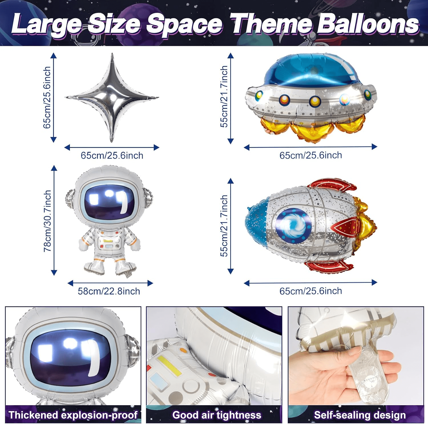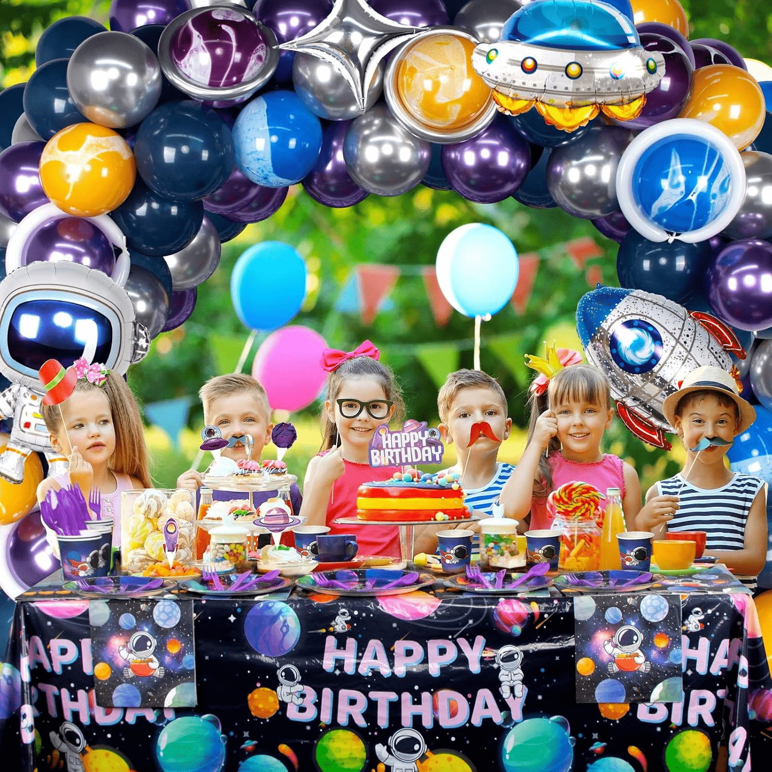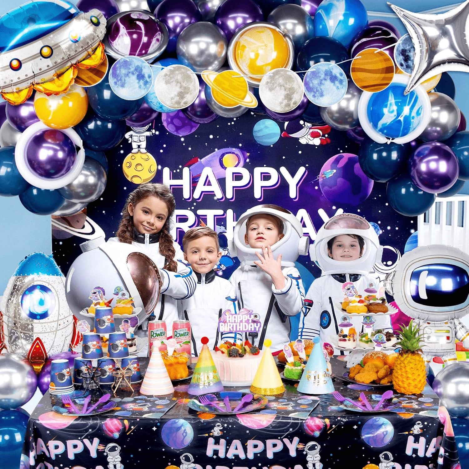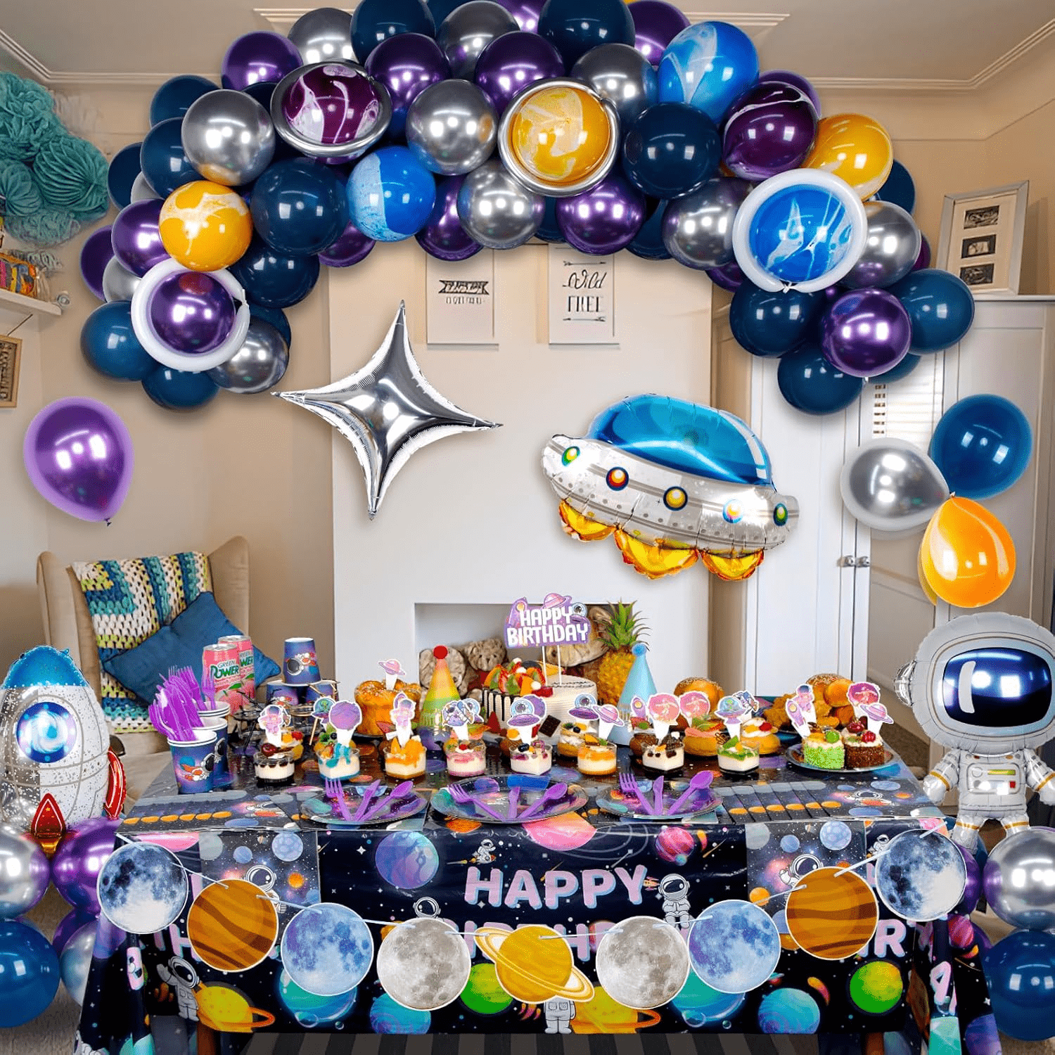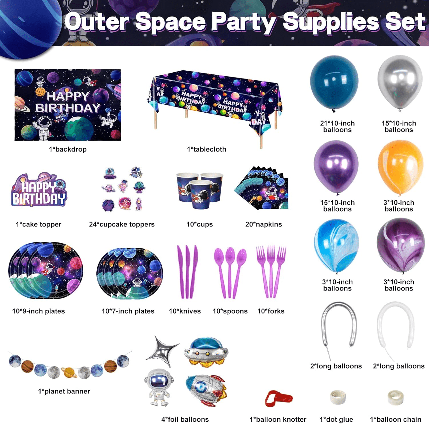 - Outer Space Birthday Party Supplies Set: HJINGY space themed party decorations set will satisfy all your demands for boys birthday decorations, including 64*latex balloons, 1*astronaut balloon, 1*rocket balloon, 1*UFO balloon, 1*star balloon, 1*space backdrop, 1*planet banner, 1*tablecloth, 1*cake topper, 24*cupcake toppers, 10*9-inch plates, 10*7-inch plates, 10*cups, 20*napkins, 10*knives, 10*forks, 10*spoons, 1*dot glue, 1*balloon chain, 1*balloon knotter
