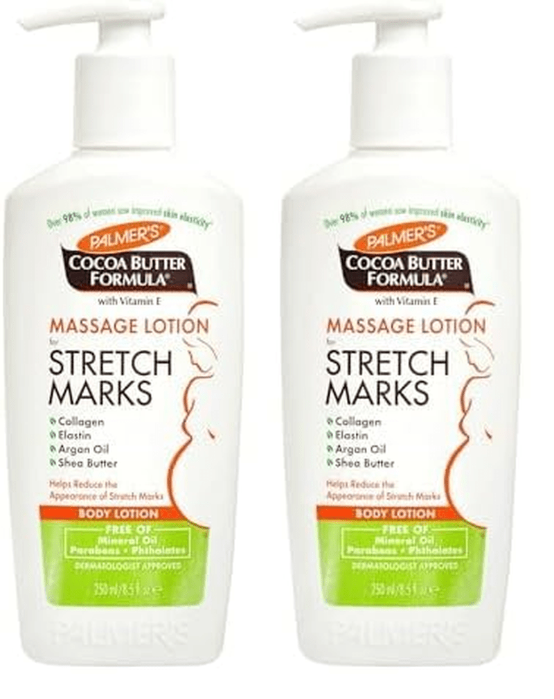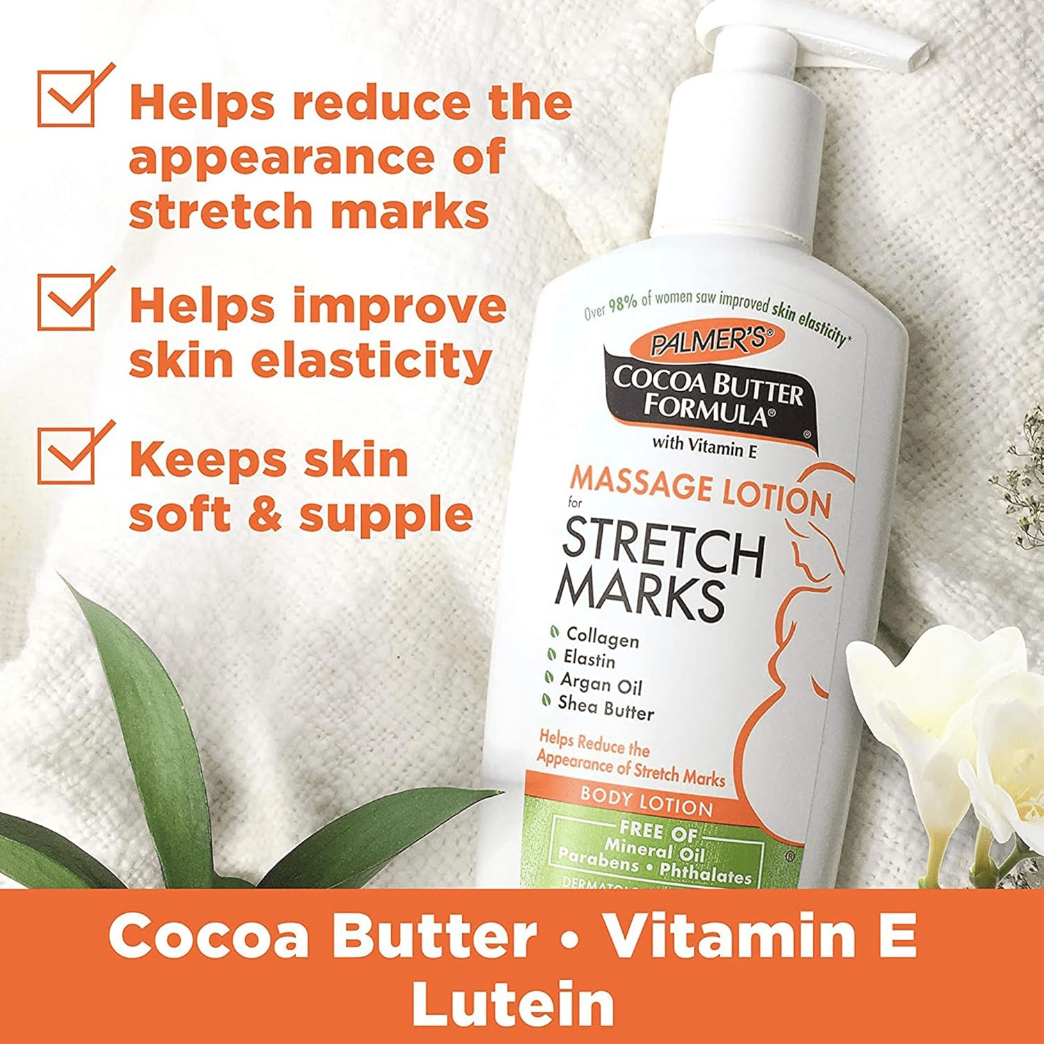 Nine out of ten pregnant women develop stretch marks at some point in their pregnancy. And aside from the belly, thighs, hips, breasts, and buttocks can all show signs of stretching. The cause? The collagen and elastin fibers that keep your skin firm and tight stretch and tear due to the pregnancy hormones and the pressure on your body from the rapid weight gain. While you can’t prevent stretch marks, you can help reduce their appearance with the support from Palmer’s. Whatever product you choose – whether it’s a stretch mark cream, a stretch mark oil, or a stretch mark lotion, natural cocoa butter is safe to use on your body while pregnant and helps reduce stretch marks as you and your baby grow. Palmer’s Cocoa Butter Formula Massage Lotion helps visibly improve skin elasticity and reduce the appearance of stretch marks. Pure Cocoa Butter, Shea Butter, Natural Oils, Collagen, Elastin, and Lutein keep skin moisturized and supple for 48 hours. A pregnancy must have, this everyday body lotion is widely recommended for stretch marks during and after pregnancy. This non-greasy lotion is ideal for all over body use, in place of your regular skin moisturizer. Proudly made in U.S.A.