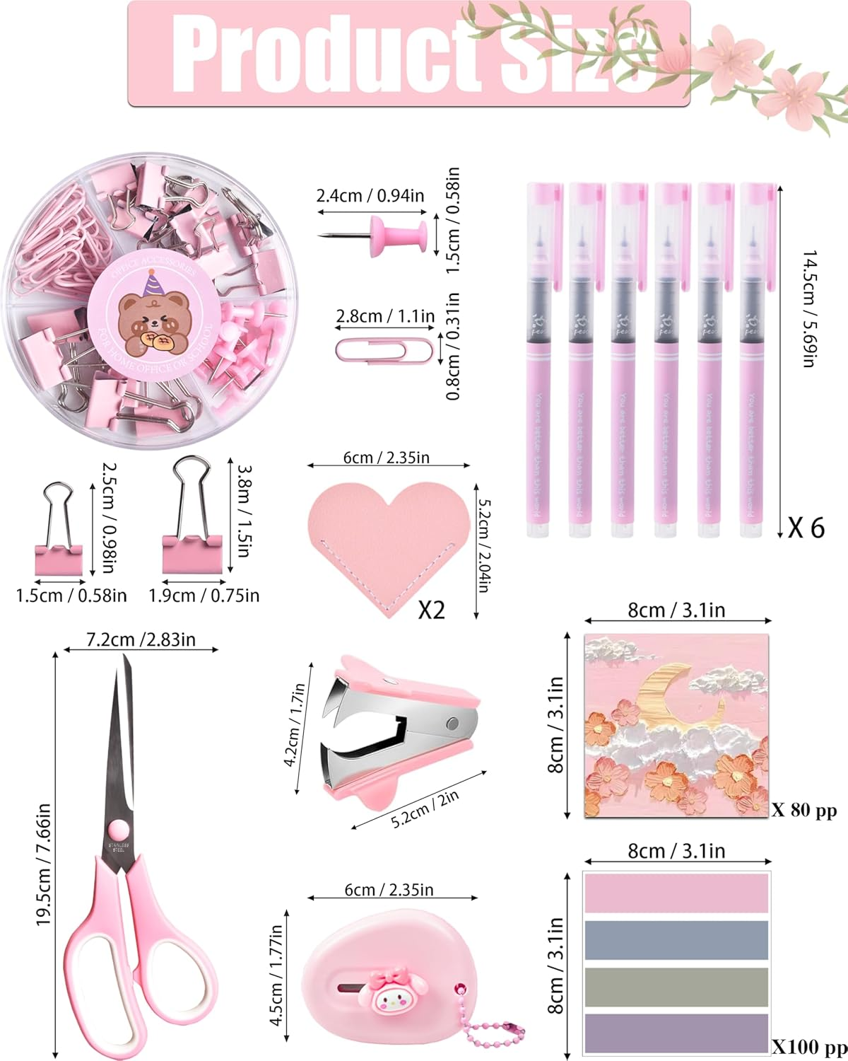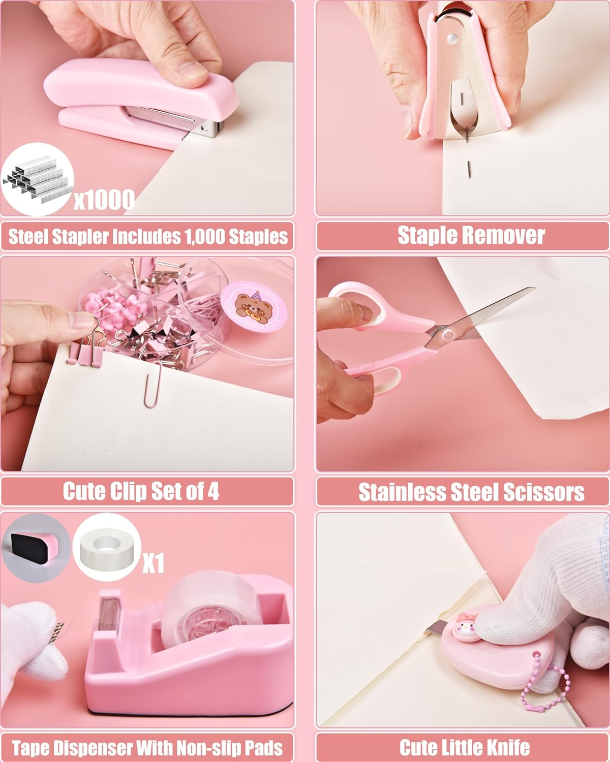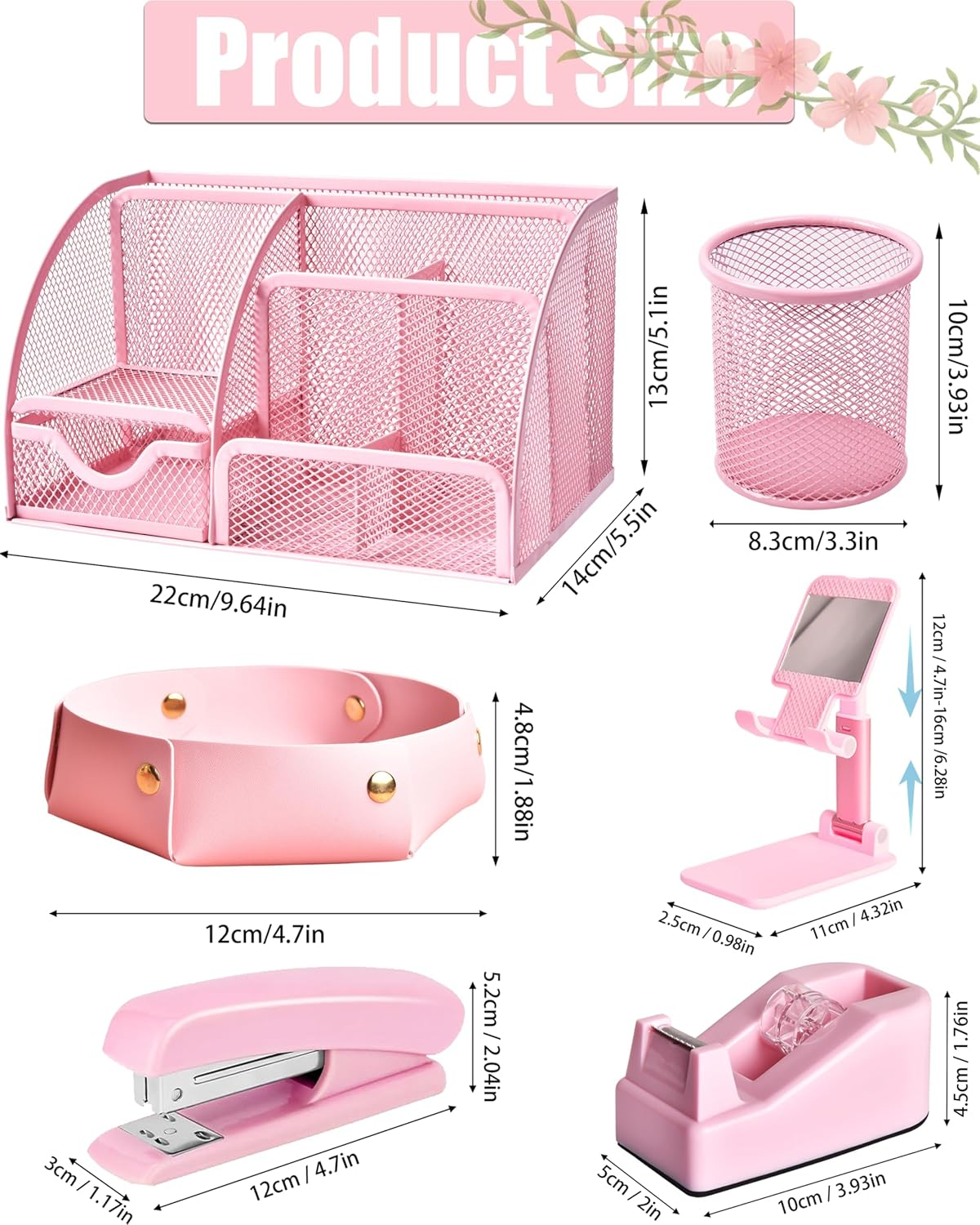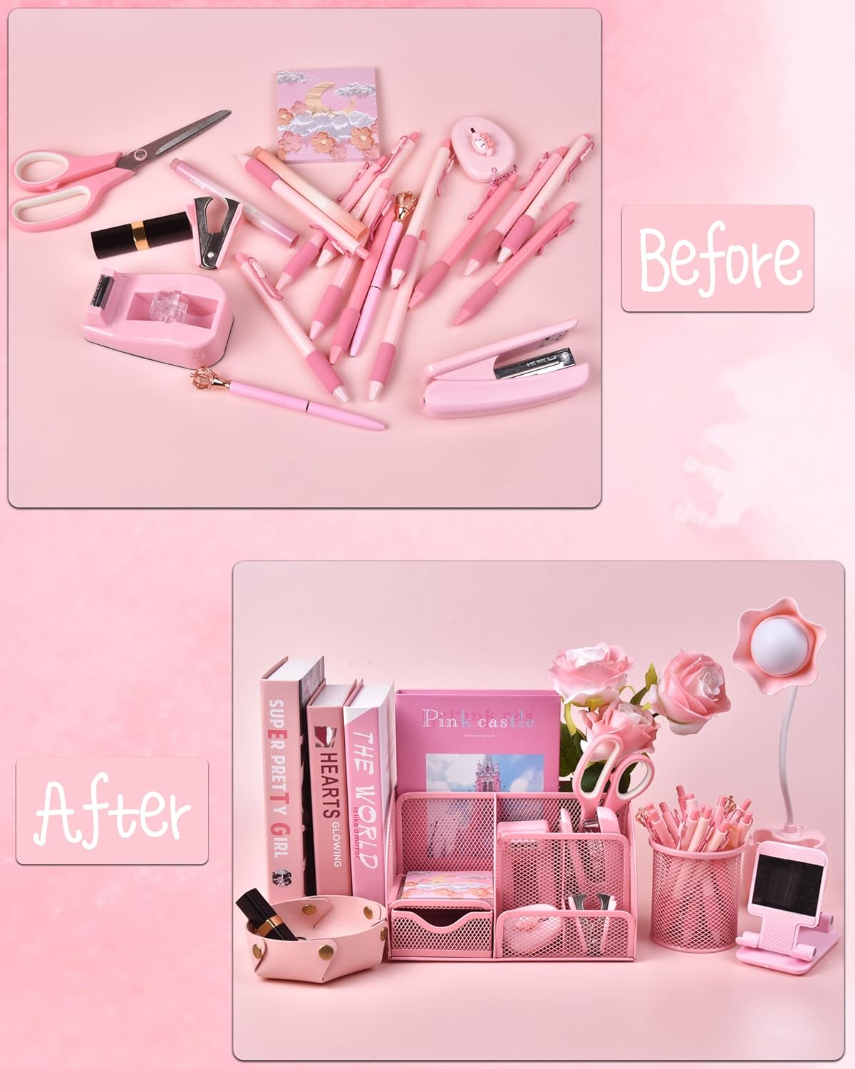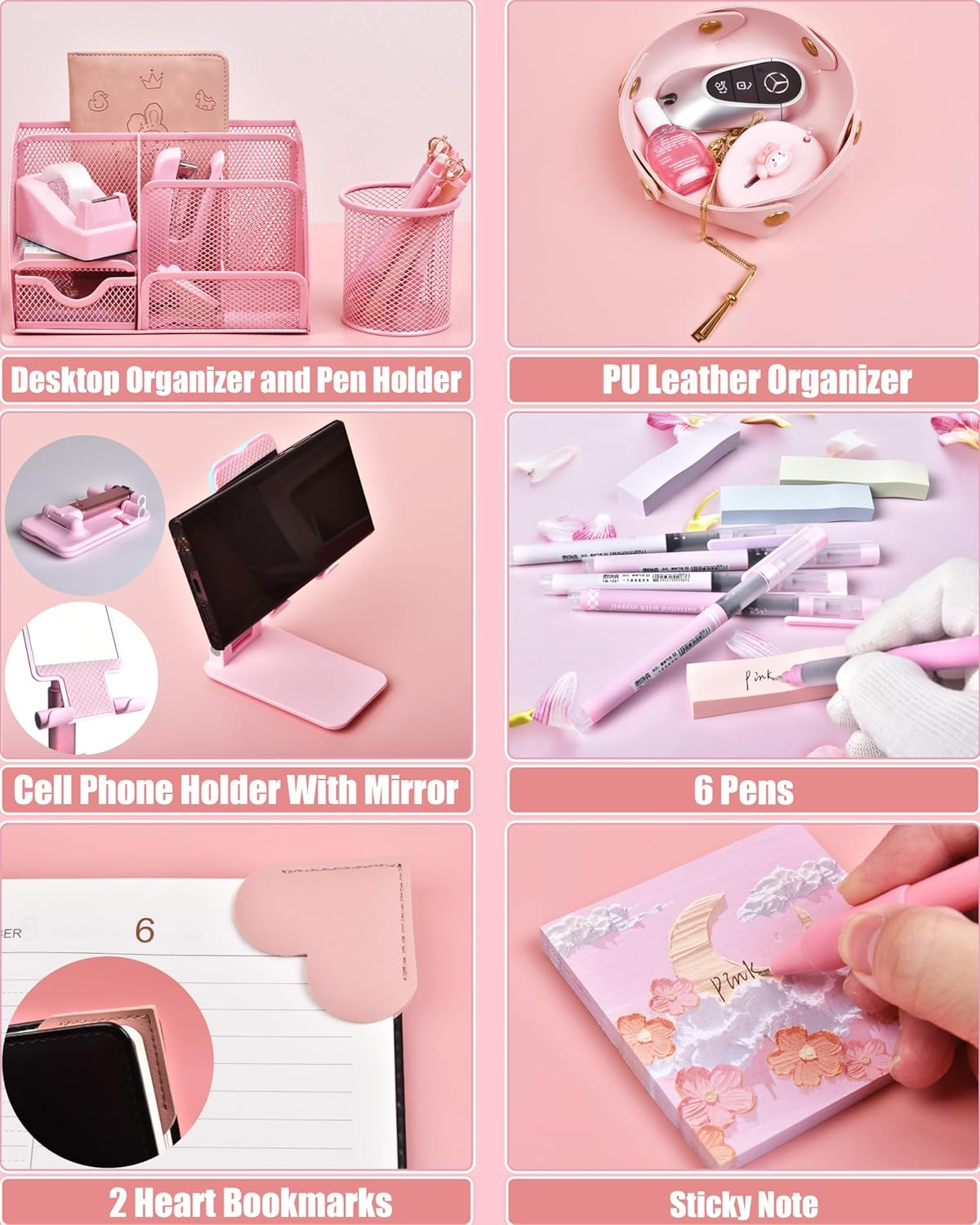 - Elevate your workspace aesthetics with the LXEVIHK Pink Desk Accessories set, featuring 24 essential office supplies and organizers designed to harmonize both style and functionality. This comprehensive collection includes a mesh desk organizer, PU leather organizer, cell phone holder, pen holder, a variety of clips, a stapler with 1,000 staples, a staple remover, tape dispenser with adhesive tape, a ruler, scissors, a cutter, two books of sticky notes, two heart-shaped bookmarks, and six pens. Perfect for students, teachers, or office professionals, this kit offers everything you need to streamline your workspace while adding a lovely pastel touch.
