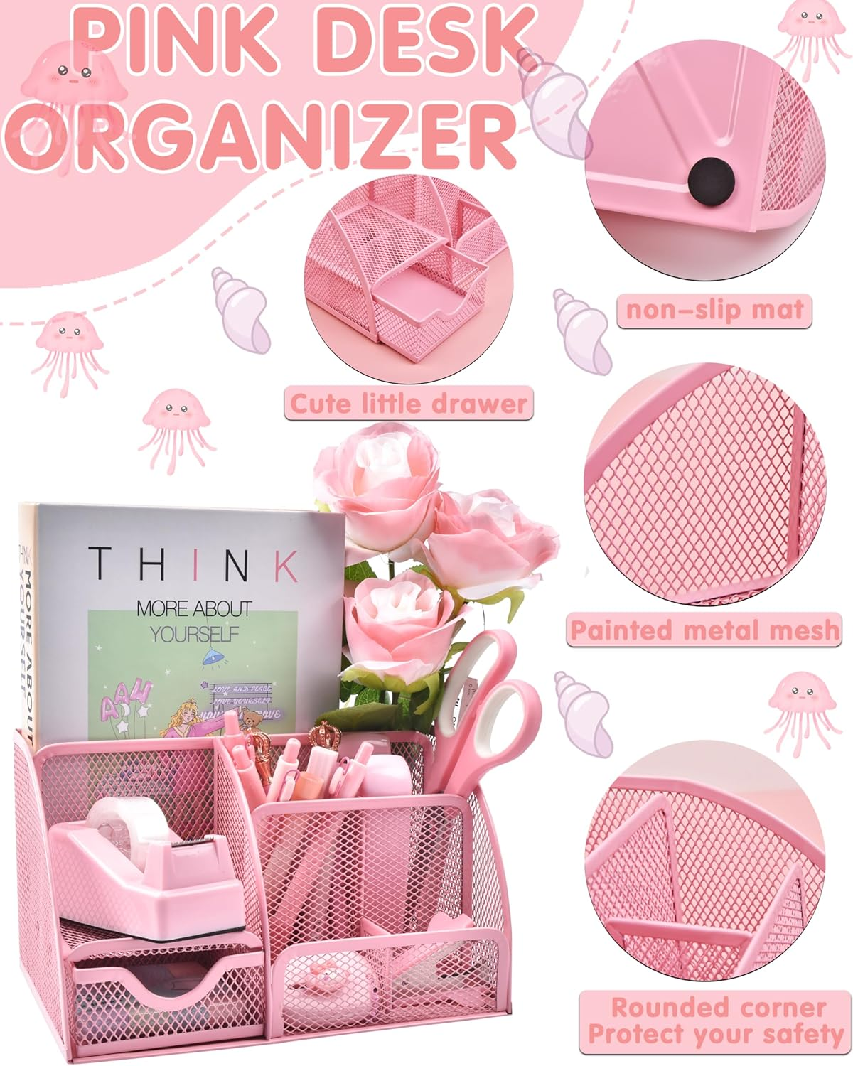 - Designed with practicality in mind, this set enhances productivity by minimizing clutter and organization problems. The sturdy metal mesh desk organizer features six compartments and one sliding drawer, keeping your supplies neatly arranged and easily accessible. With its electroplated, wear-resistant surface and non-slip pads, this accessory will stay securely in place on your desktop. Moreover, the uniform pink color adds a modern vibe to your workspace, making it not only a practical investment but also an ideal gifting option for pink enthusiasts.