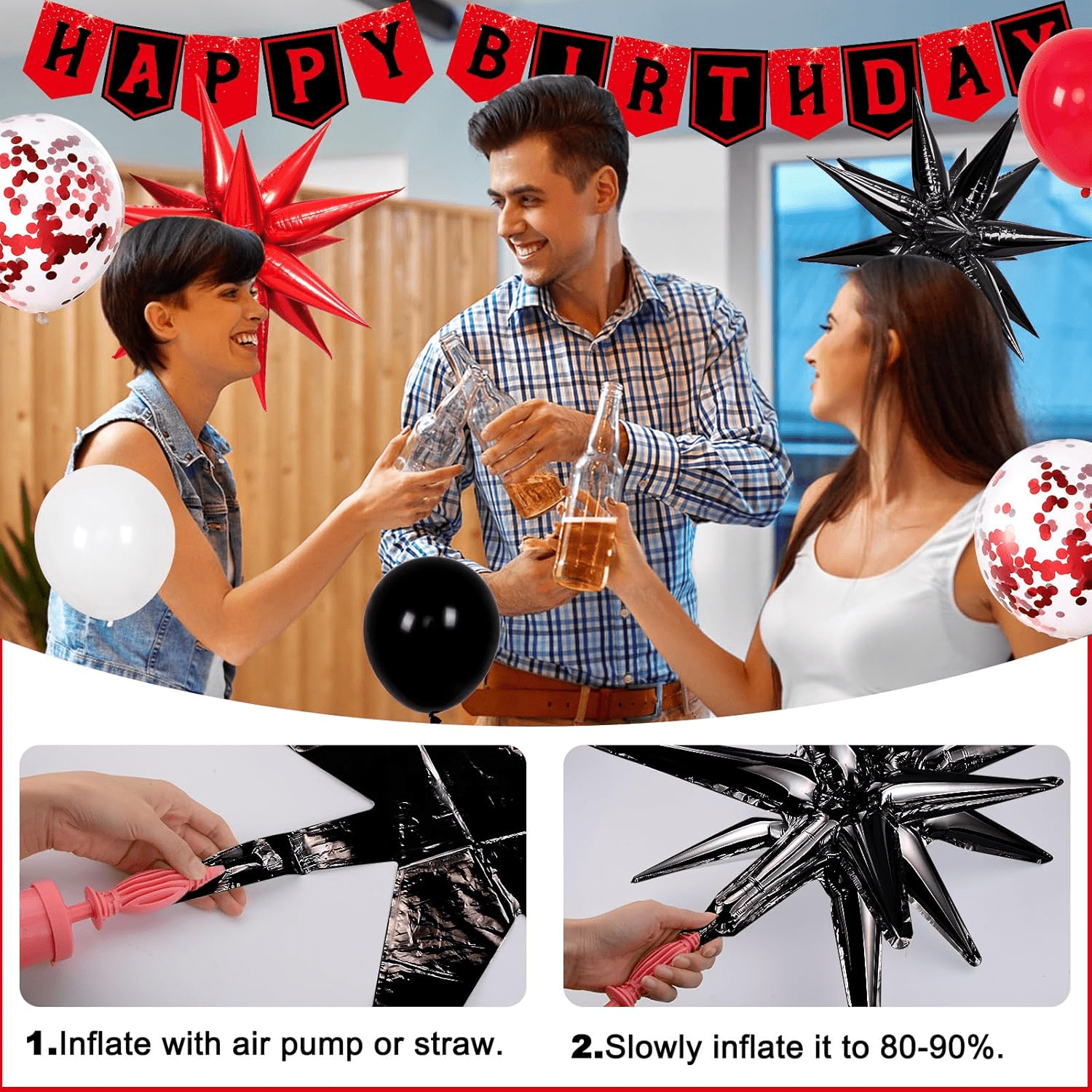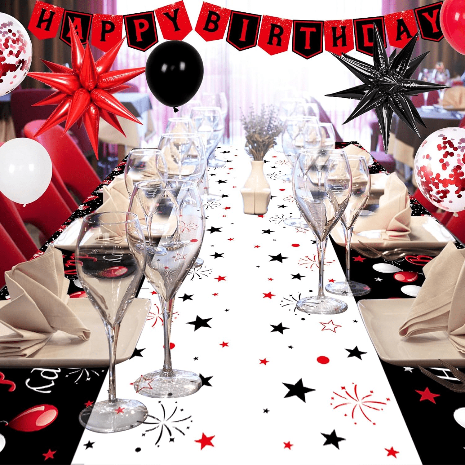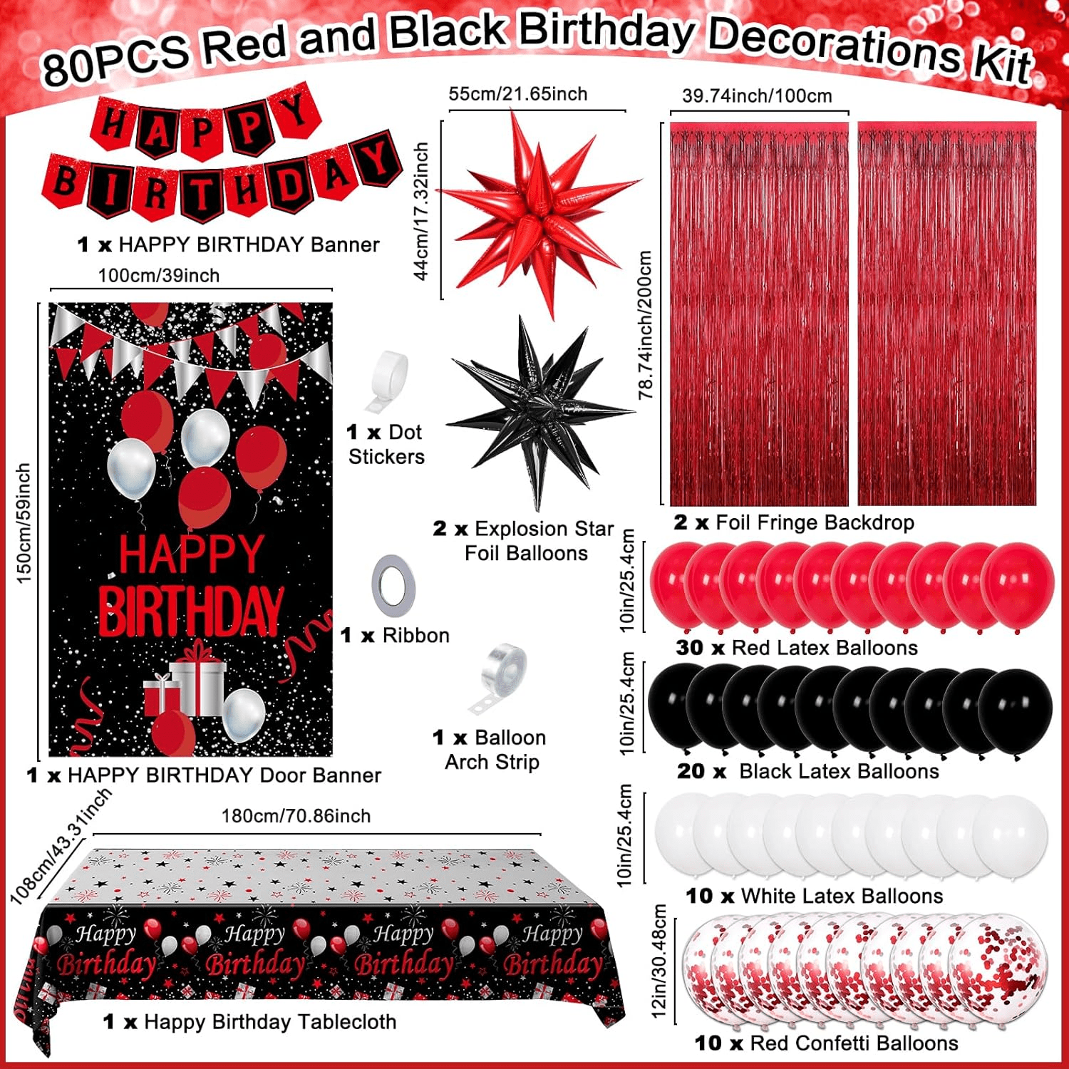 - 80PCS Red and Black Party Decorations Pack – The red and black birthday decorations kit includes 1 x happy birthday door banner, 1 x happy birthday banner, 1 x happy birthday tablecloth, 2 x red foil fringe backdrop, 2 x explosion star foil balloons(1pc red + 1pc black), 60 x 10in latex balloons(red x 30 + black x 20 + white x 10), 10 x 12inch red confetti balloons, 1 x balloon arch strip, 1 x dot stickers, 1 x ribbon. One package meets you birthday party needs