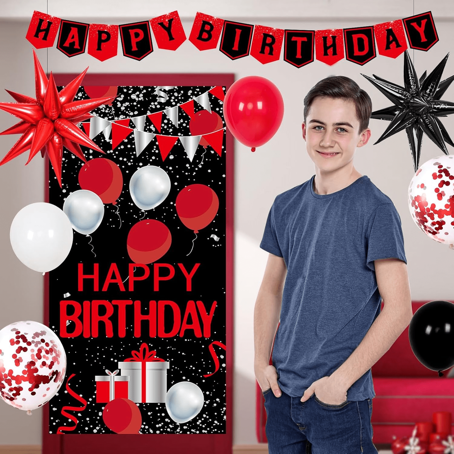 - About Quality – The red black balloons are made of thick latex, not easy to burst. The happy birthday door banner can be applied many times, easy to fold and carry, great to make combinations and decorate your party. The shiny foil backdrop will make your party more lively. No matter what age, create a dreamy and unforgettable birthday party for your family or friends