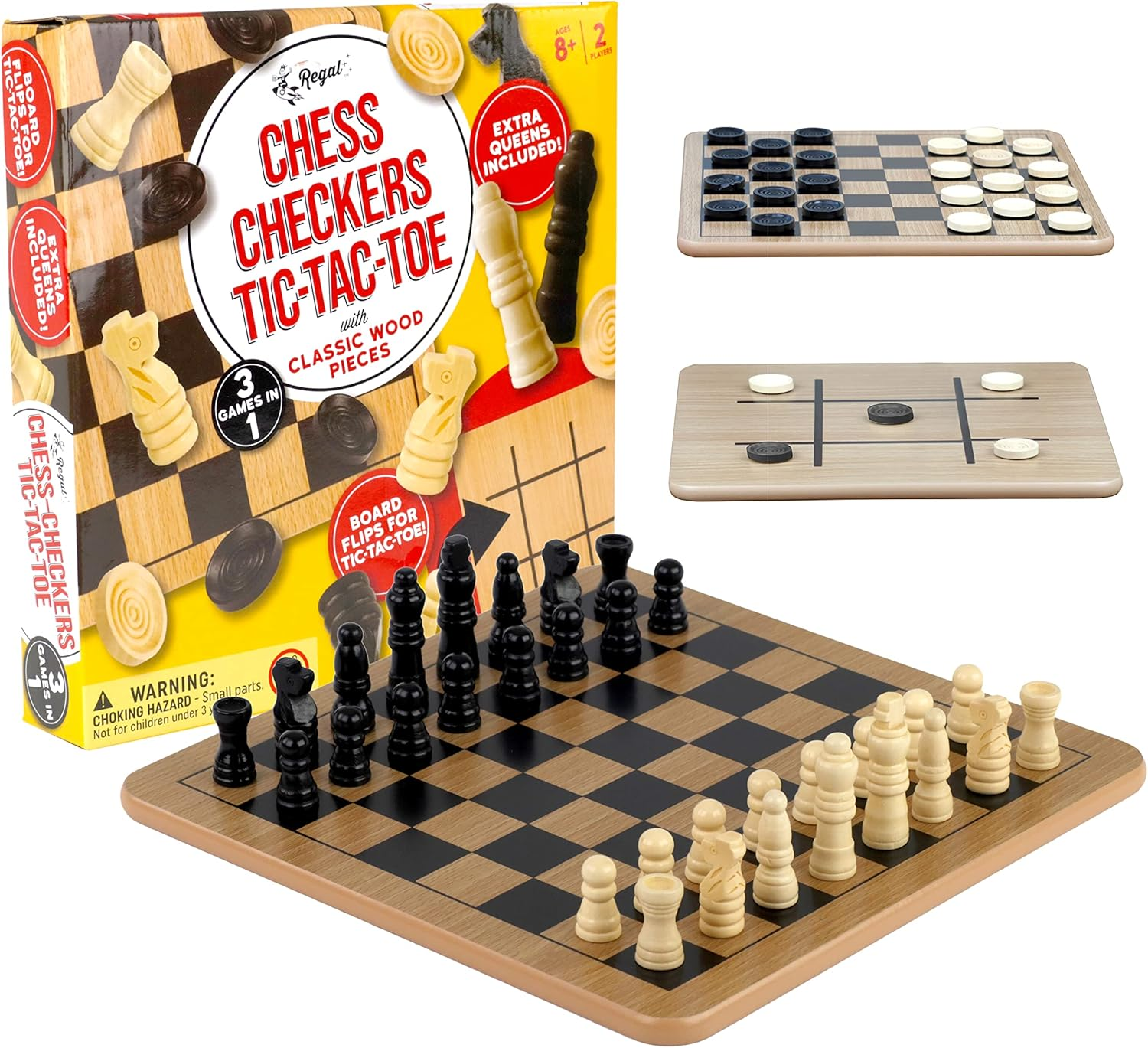 - Versatile Gaming Experience: The Regal Games Reversible Wooden Board provides an exceptional gaming experience with options for playing Chess, Checkers, and Tic-Tac-Toe. Measuring 10.5″ x 10.5″, it is ideal for family game nights, travel, sleepovers, and social gatherings, ensuring entertainment is always at hand. The portability of this board makes it easy to transition from home play to on-the-go fun, keeping your game nights lively and accessible.