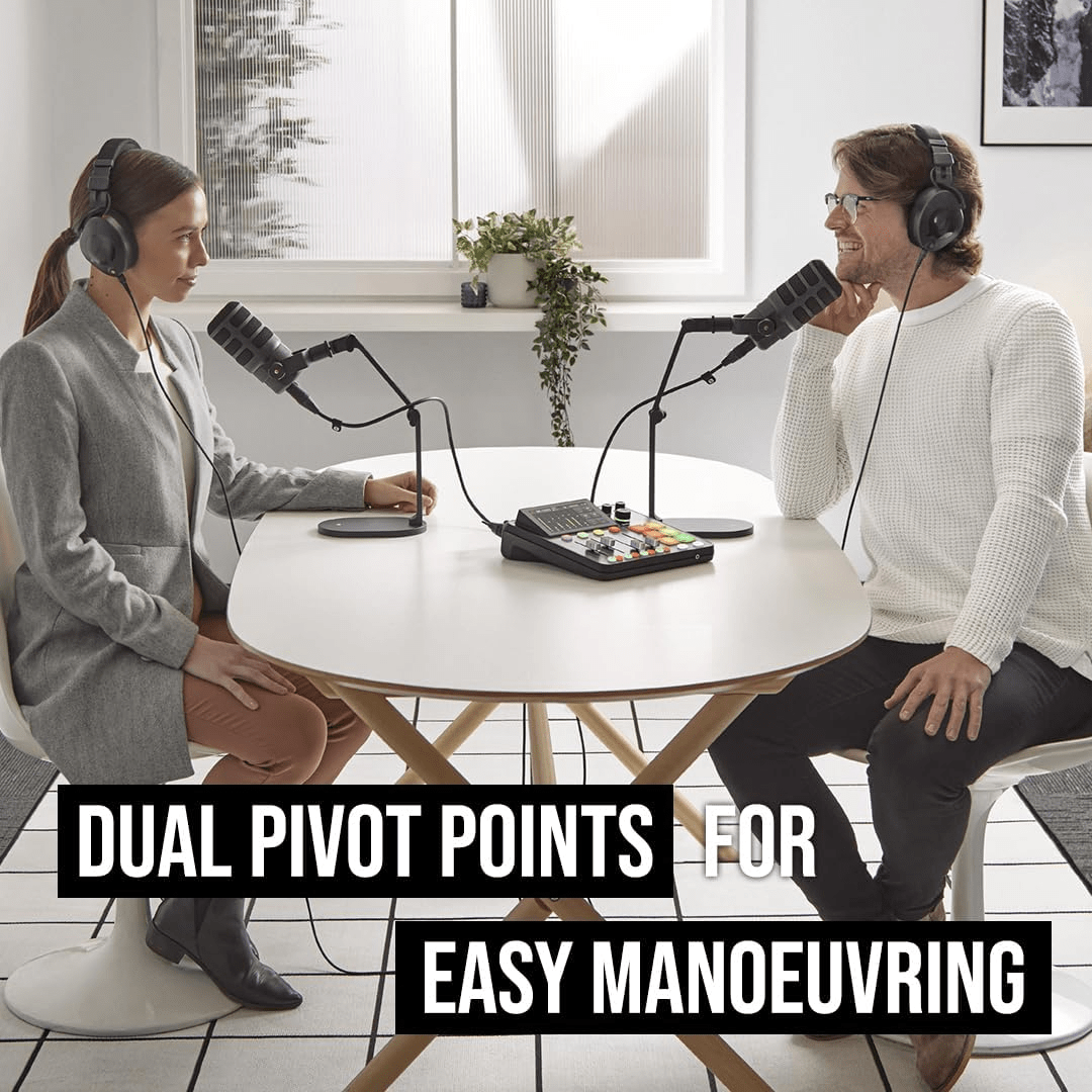 • Heavy base stand with two pivot points for easy and customizable positioning of microphones and other equipment.