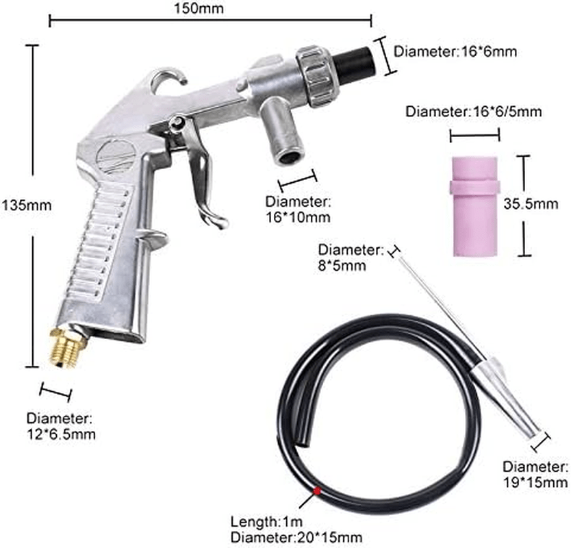• Package includes: 1 Sand Blaster Gun, 1 Steel Nozzle, 1 Air Quick Adapter, 1 Sand Suction Pipe, and 4 Ceramic Nozzles.