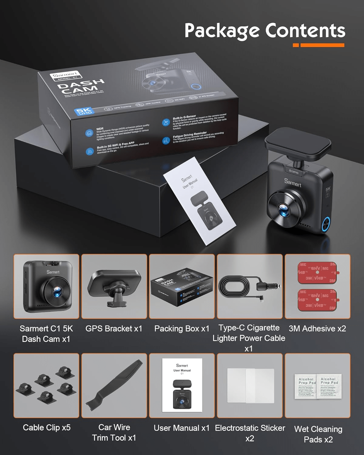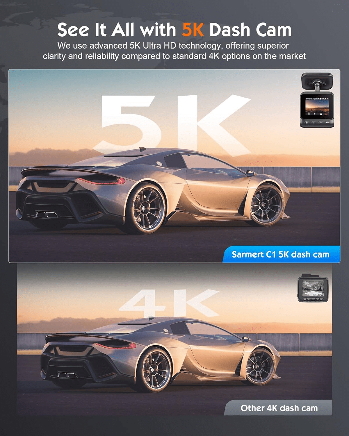 - UNLEASH THE POWER OF ADVANCED 5K UHD RECORDING: The Sarmert C1 5K dash cam captures stunning video at 5120*2160P, offering exceptional clarity that distinguishes it from other dash cams. Equipped with a Sony STARVIS Image Sensor, its advanced technology ensures every detail is recorded precisely. Our car camera also supports versatile options, including 4K resolution at 3840*2160P and 2.5K at 2560*1440P. Adjustable resolutions balance clarity and storage for road trips or daily commutes.