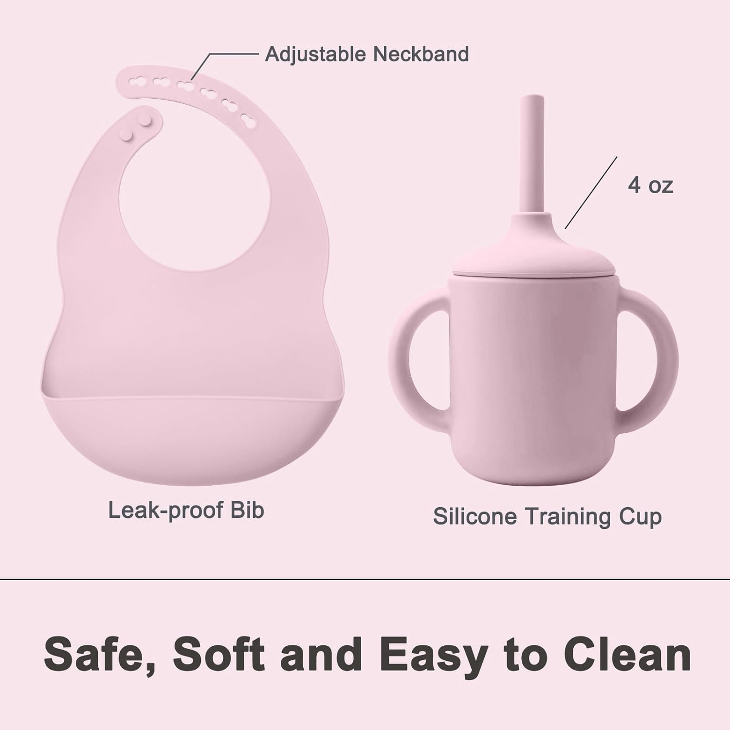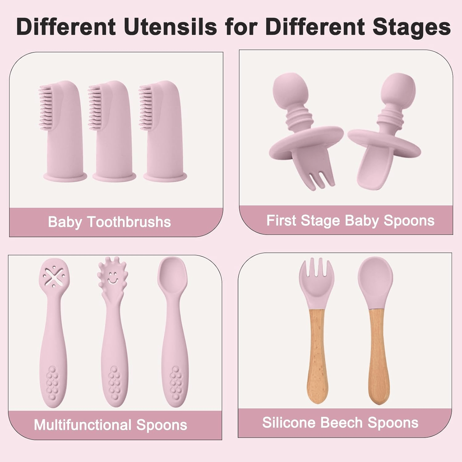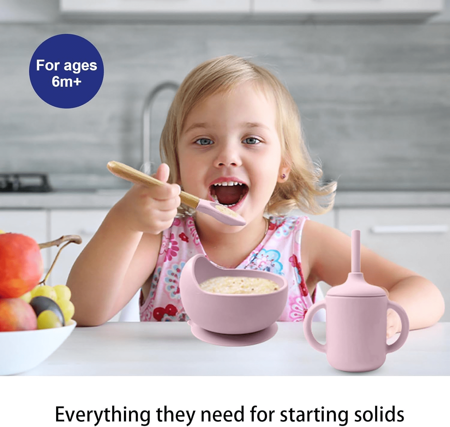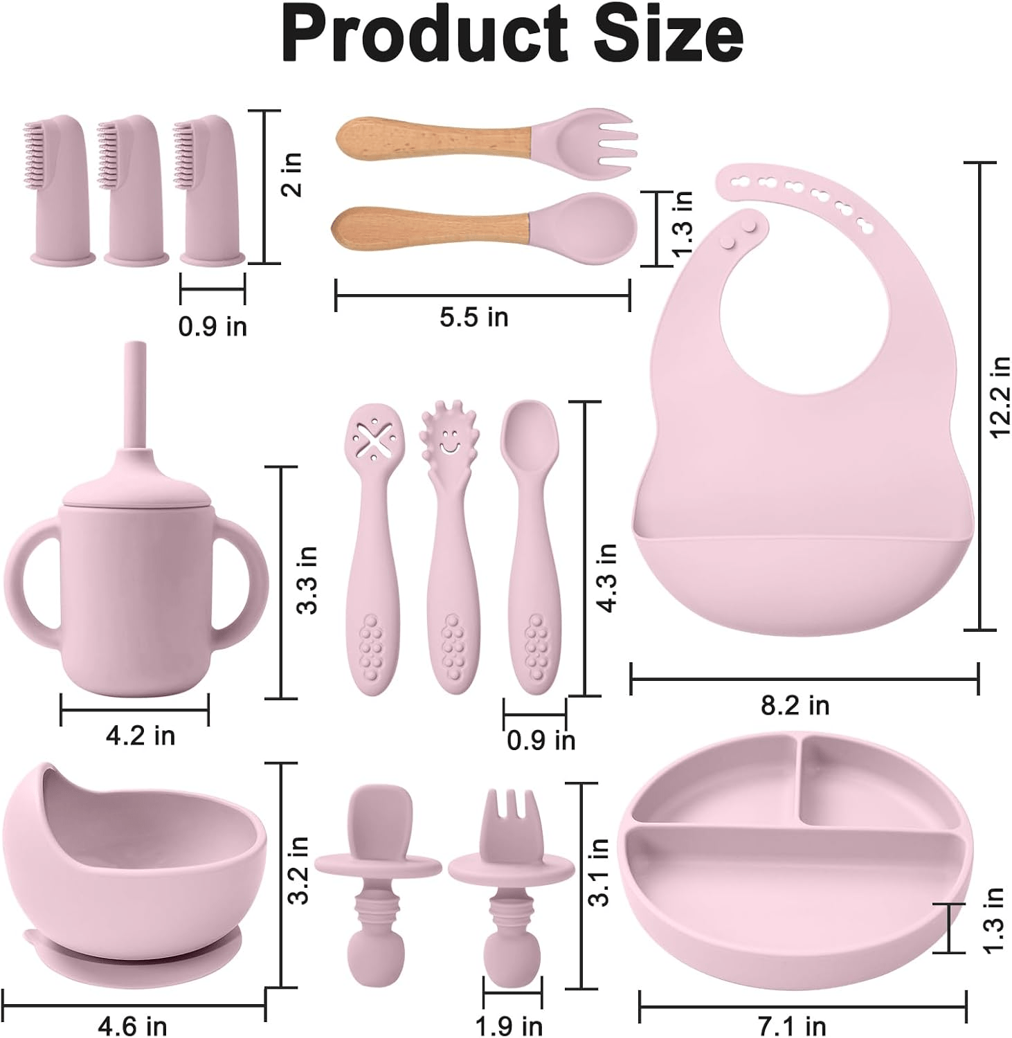 - Enhance mealtime experience with the Silicone Baby Feeding Set, designed to foster a love for food in your little one while providing convenience to parents. This comprehensive 14-piece set includes a suction-divided plate, suction bowl, wooden fork and spoons, a straw cup with a spill-proof straw, and a bib with a catch pocket. These thoughtfully crafted utensils are perfect for babies aged 6 months and above, making them ideal for early stages of solid food exploration.