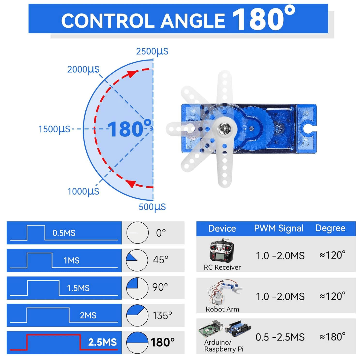• Designed for versatility, this kit’s servos operate at a remarkable speed of 0.08 seconds per 60 degrees and deliver a stall torque of 1.9 kg/cm, allowing precise 180° movement. Compatible with popular platforms such as Arduino and Raspberry Pi, the servos offer easy integration into your projects through a simple 3-pin PWM hookup. Each motor also comes with servo arms and 24.5 mm lead wires for a tidy setup, facilitating an efficient build process.