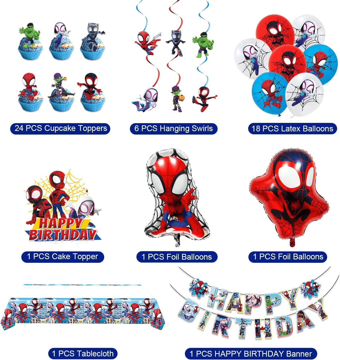- 【Package Includes】 This Spidey party decorations kit includes 1pcs Happy Birthday Banner, 1pcs Tablecloth, 1pcs Cake Topper, 2 Foil Balloons, 6pcs Hanging Swirls, 24pcs Cupcake toppers, 18pcs Latex Balloons(3style). It has everything you need for a Spidey themed birthday party.
