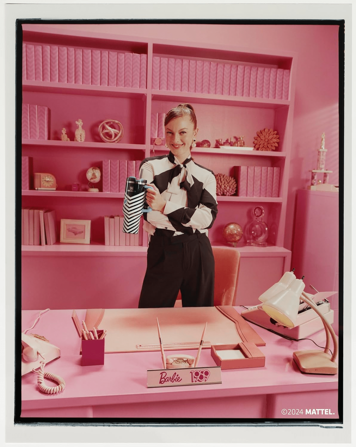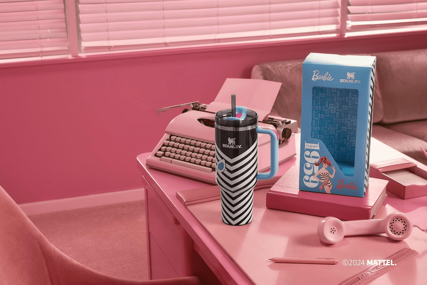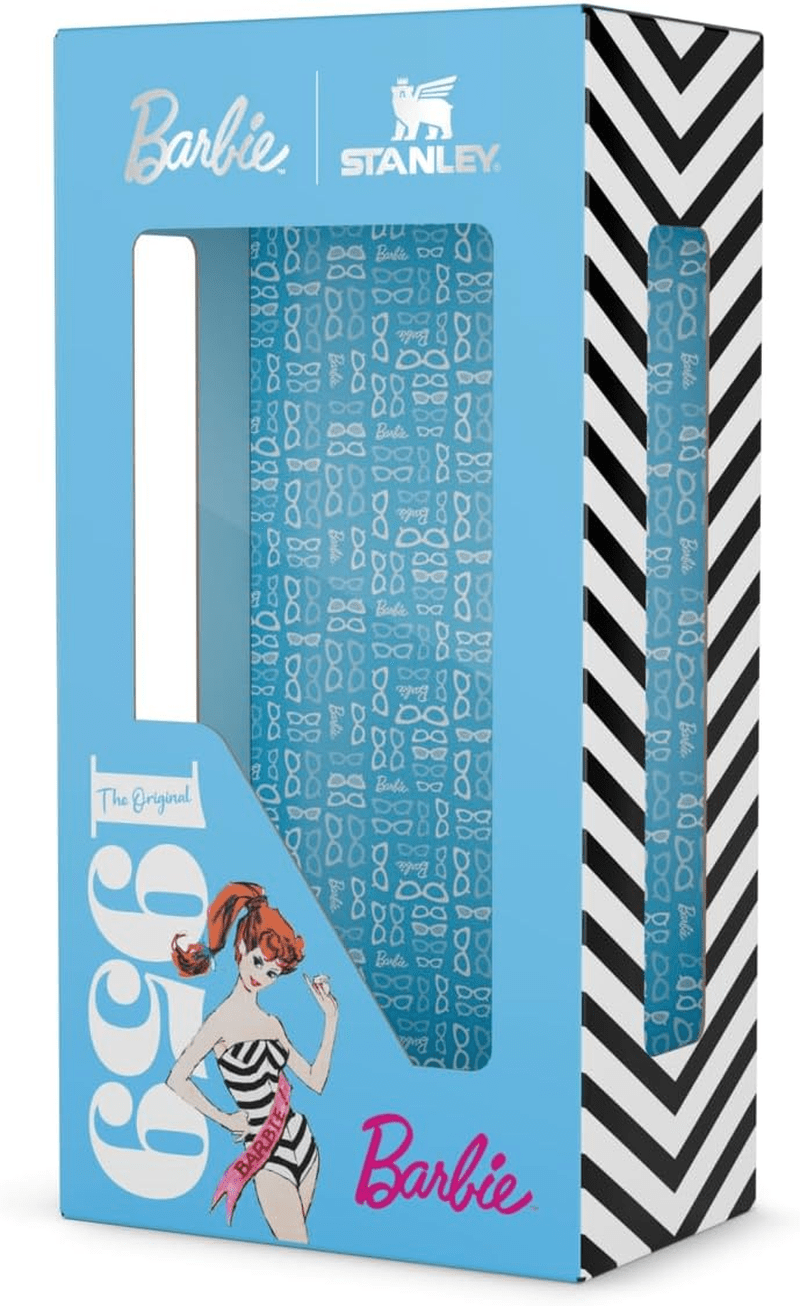 - Featuring a striking chevron print that pays tribute to the iconic OG Barbie™ doll, this tumbler showcases a chic black and white vintage swimsuit with vibrant pool blue and hot pink accents that perfectly complement the classic cat-eye sunglasses.