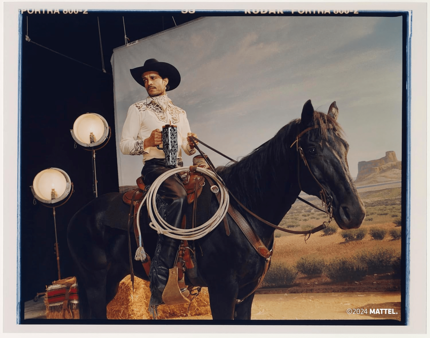 • Lasso your own Western Ken Quencher in a captivating Midnight-black hue. The design features a unique print that emulates the contrast stitching and silver buckle seen on the iconic Western Ken doll, inviting you to embark on your next adventure in style.