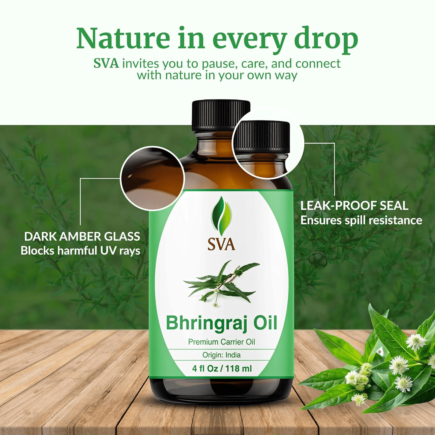 • Premium Quality Carrier Oil: SVA Bhringraj Oil is meticulously extracted through a cold-press process from Eclipta Prostrata leaves, ensuring the retention of essential nutrients and properties. This carrier oil is free from preservatives and is presented in an elegant amber glass bottle with a convenient dropper for precise application. Our commitment extends to ethical practices, ensuring that no animal testing is involved in our product development.