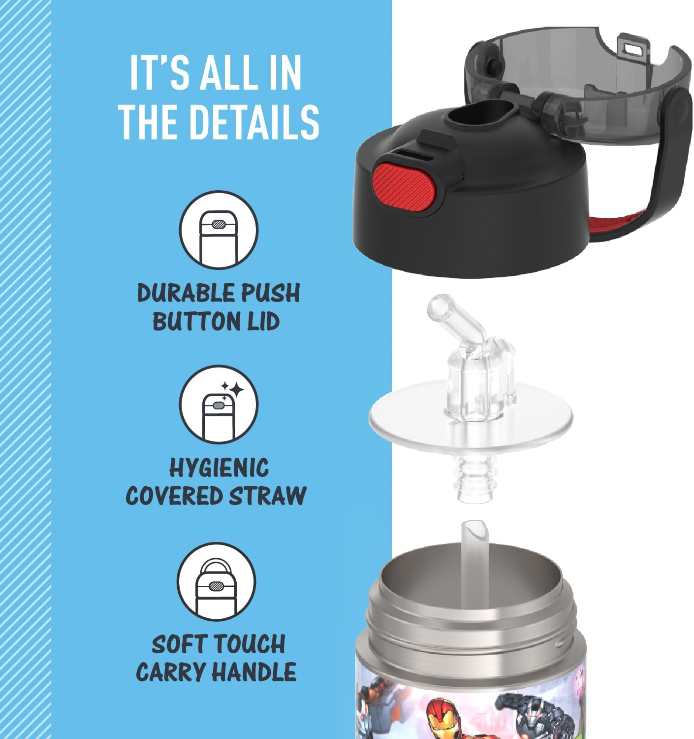 THERMOS FUNTAINER Water Bottle with Straw – 12 Ounce – Kids Stainless Steel Vacuum Insulated Water Bottle with Lid, Avengers