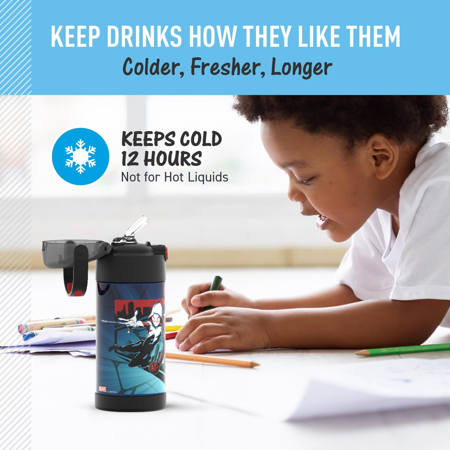 • Stays cold for up to 12 hours: Featuring THERMOS vacuum insulation technology, this water bottle ensures that your child’s favorite drinks remain refreshingly cold throughout the day. Ideal for school, sports, or outdoor adventures, it maintains the temperature you expect from a quality thermal container. Please note that this product is not intended for hot liquids.