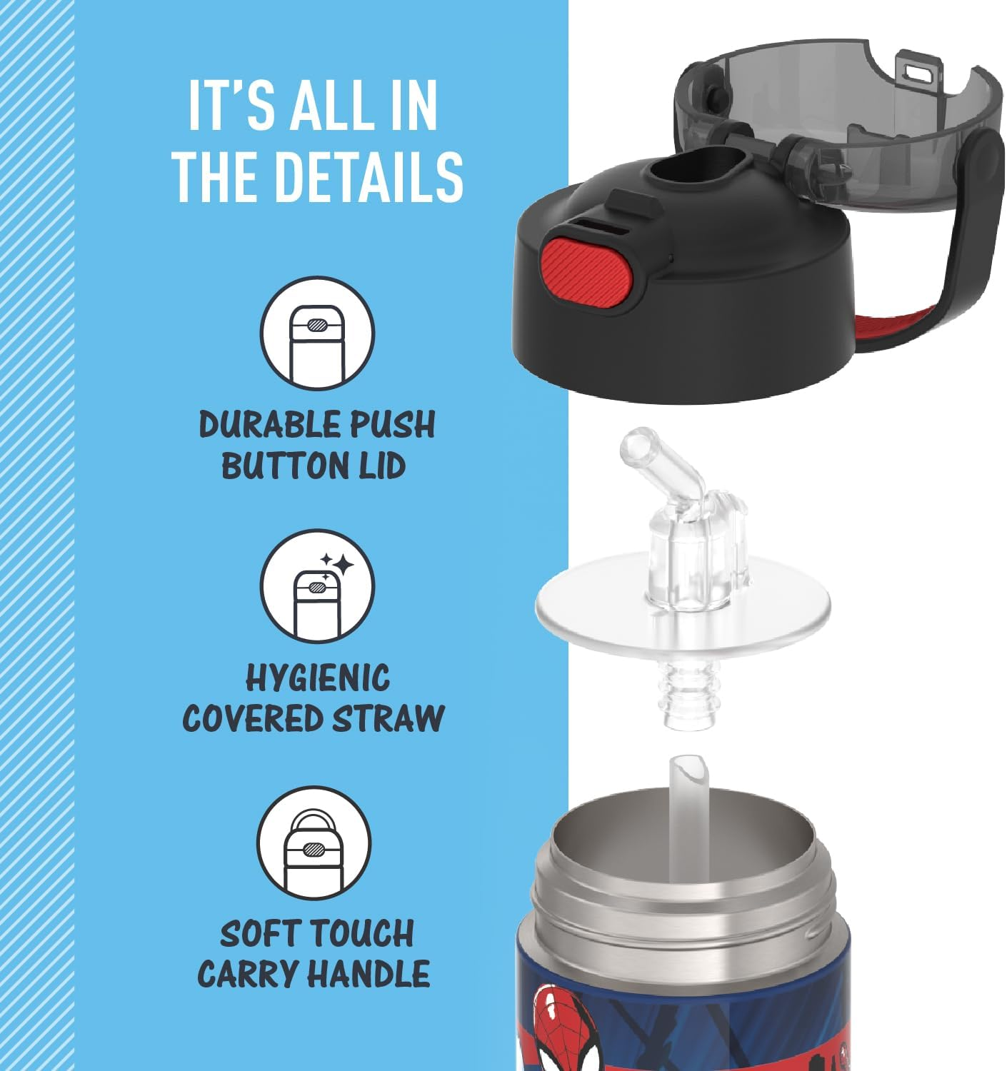 • Designed for kids: With its lightweight and compact design, this reusable metal water bottle includes a convenient push-button lid, making it easy for little hands to open and enjoy. The integrated carry handle, featuring a soft-touch grip, allows children to easily transport their water bottle wherever they go, promoting hydration habits at a young age.
