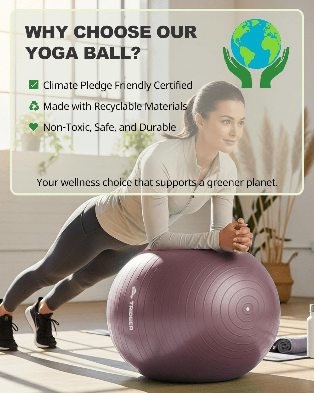 • Certified as Climate Pledge Friendly, this eco-conscious yoga ball meets California Prop 65 safety standards, ensuring your health is prioritized.