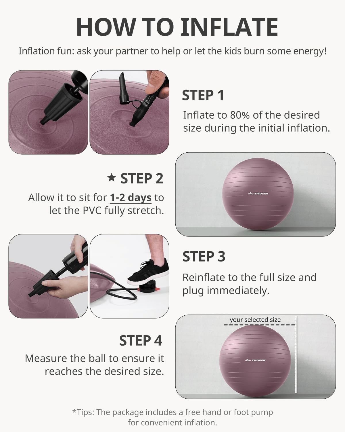 • Enhance your fitness journey with the Trideer Exercise Ball, a versatile tool designed to support a plethora of exercises, from yoga and Pilates to physical therapy and core training. This yoga ball is an excellent companion for full-body workouts, allowing you to seamlessly integrate balance and stability into your routine, whether at home or in the gym.