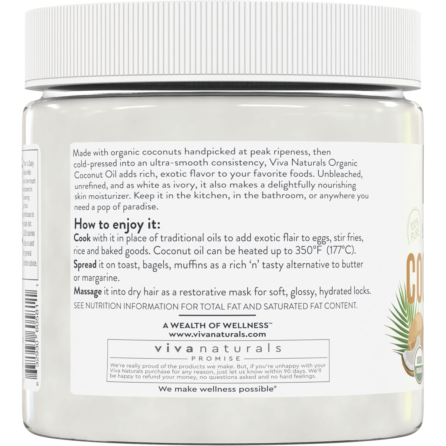 - Viva Naturals Organic Coconut Oil is a versatile, unrefined, cold-pressed extra virgin coconut oil that is perfect for a variety of uses in your daily routine. You can incorporate this coconut oil into your cooking and baking, enhancing your dishes with its rich flavor and aroma, while maintaining a healthy lifestyle. With a smoke point of 350°F, it is ideal for frying, sautéing, and even baking, making it a great alternative to traditional cooking oils like olive oil and butter.