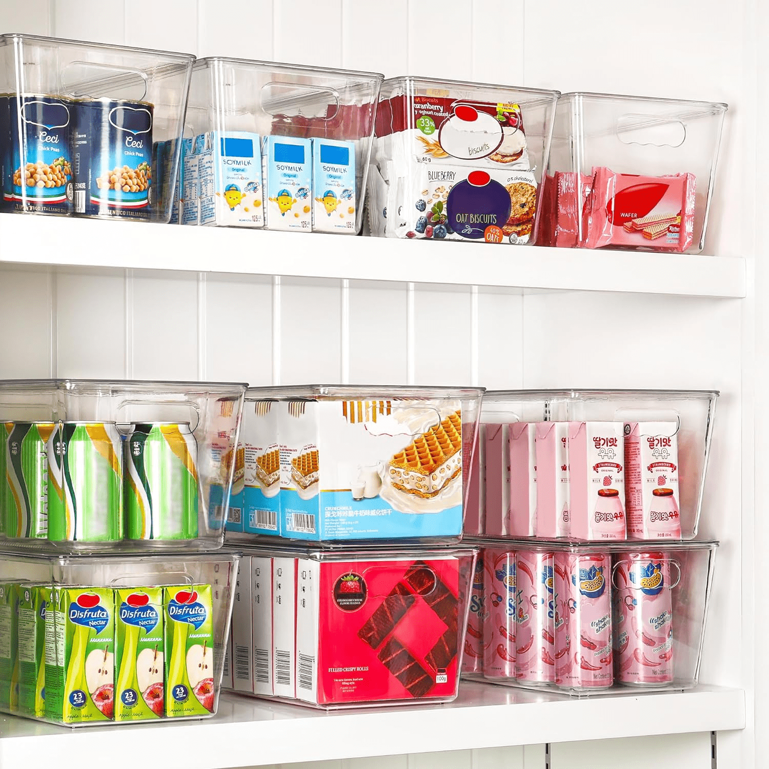 A:These clear bins can be used to organize/ store yogurts, canned goods, food packets, cheese, meat, drink boxes, baby food, juices, boxed foods, potatoes, onions, and apples…