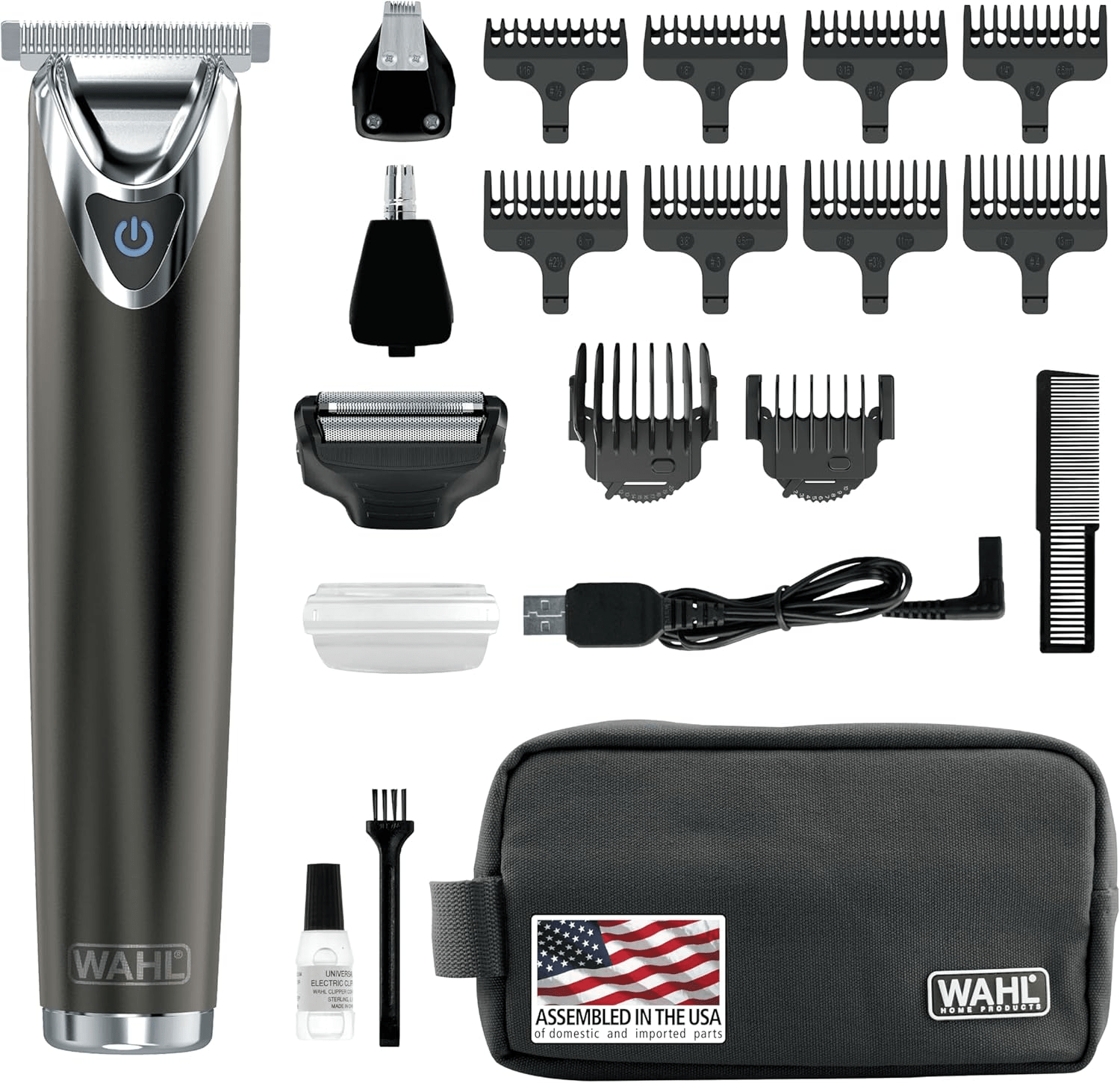 - All-in-One Men’s Beard Trimmer – The Wahl Stainless Steel Lithium Ion 2.0+ Slate Beard Trimmer offers a comprehensive grooming experience with four distinct attachment heads, including a wide T-Blade for beard and mustache trimming, body grooming, and detailed touch-ups, as well as a precision detailer head for intricate designs and clean-ups.