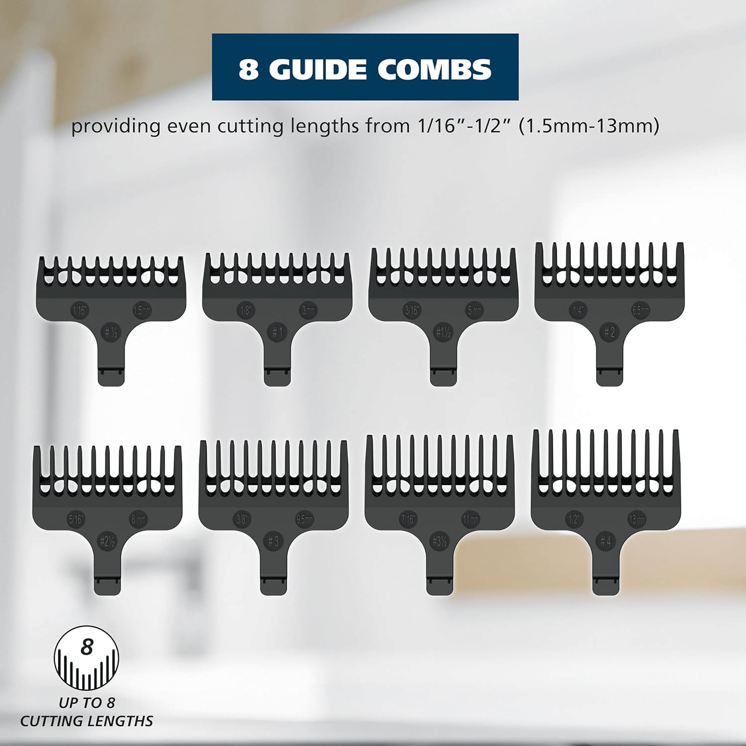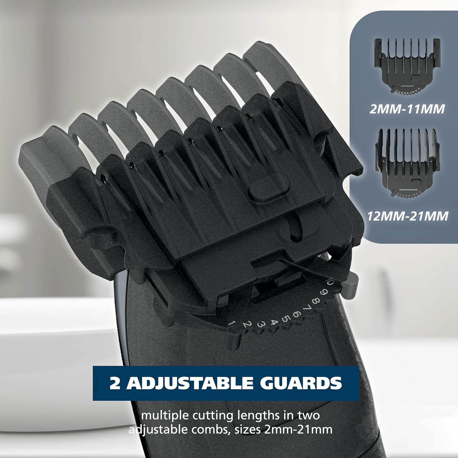 - Versatile Length Settings – The trimmer kit comes with 10 individual guide combs, including 8 T-blade guide combs for varying lengths from short (1/16”) to long (1/2”), along with 2 adjustable guide combs for further precision ranging from 2mm to 21mm, making it ideal for personalized grooming preferences.
