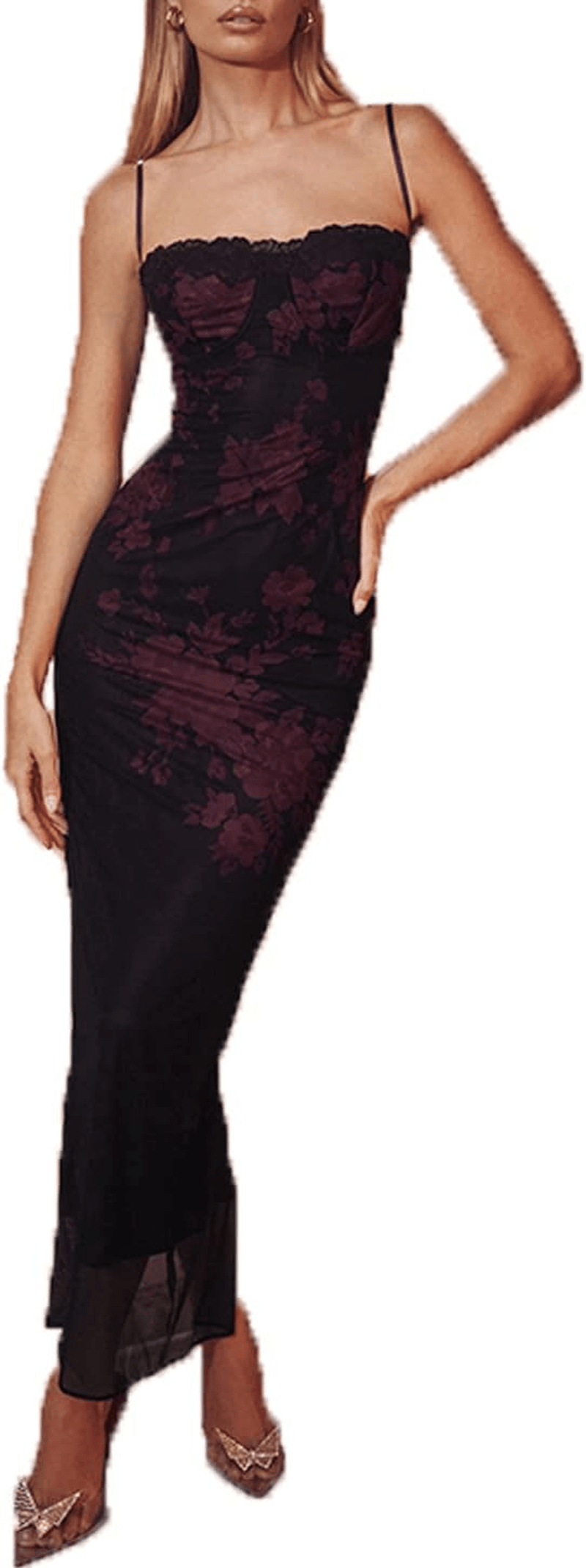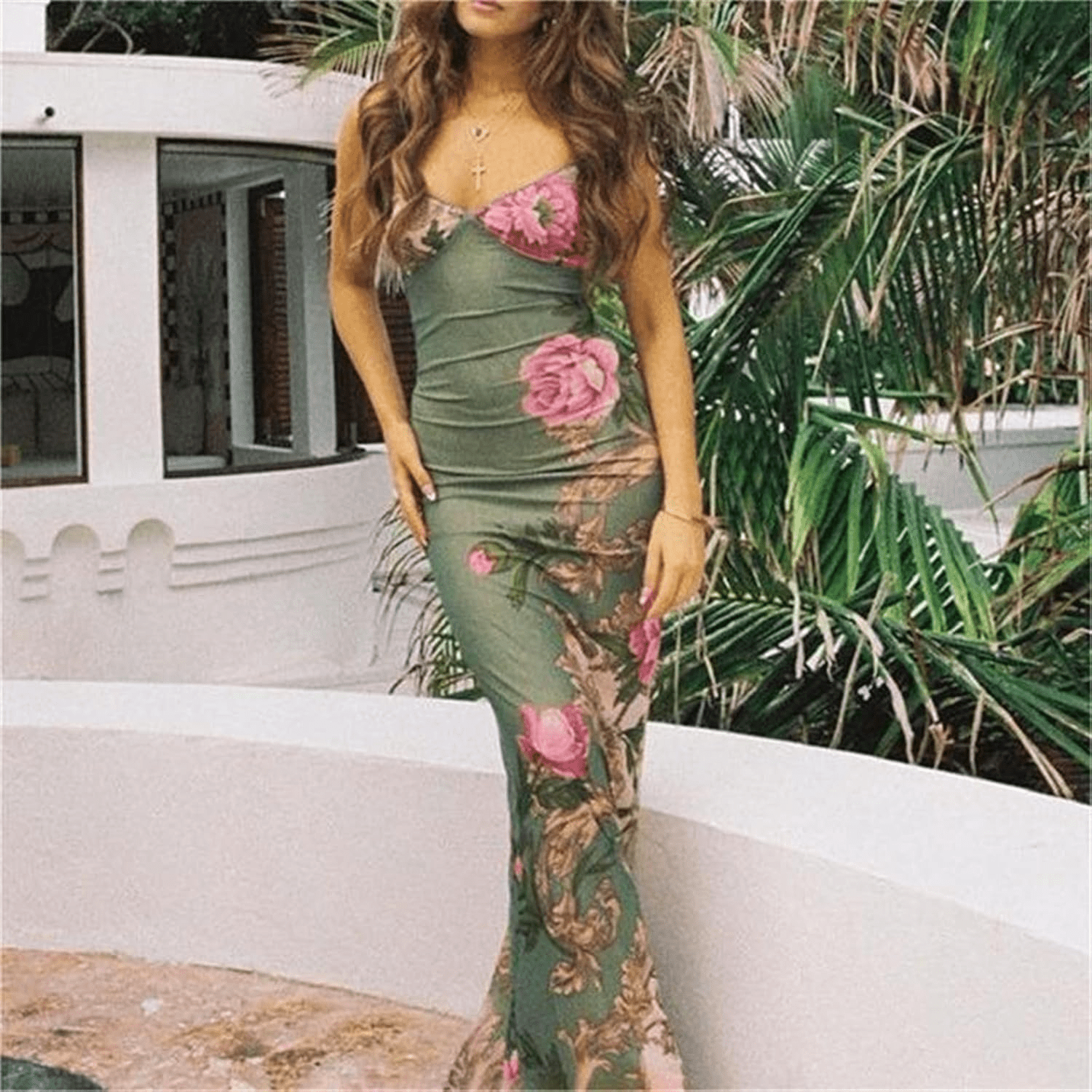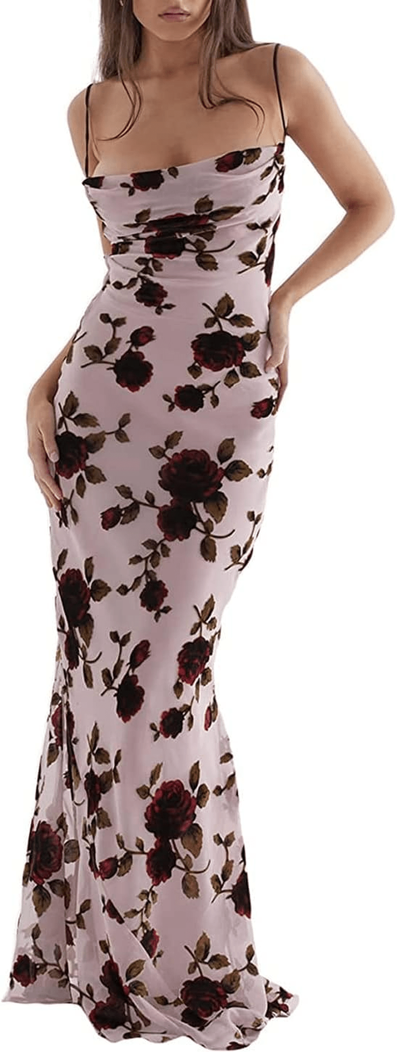 Style: Sleeveless, low-cut backless, floral, bodycon maxi with slit