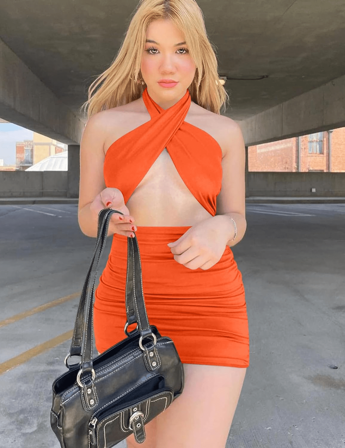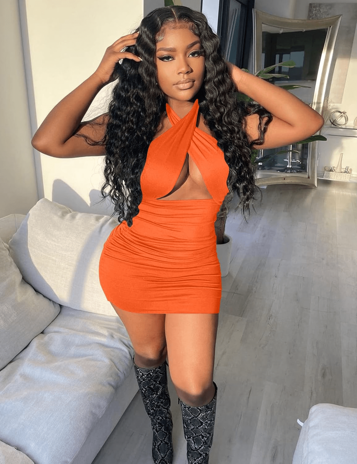cut out design, ruched on both sides and back, adjustable halter neck, criss-cross bust feature design, sexy backless, sleeveless, bodycon fit