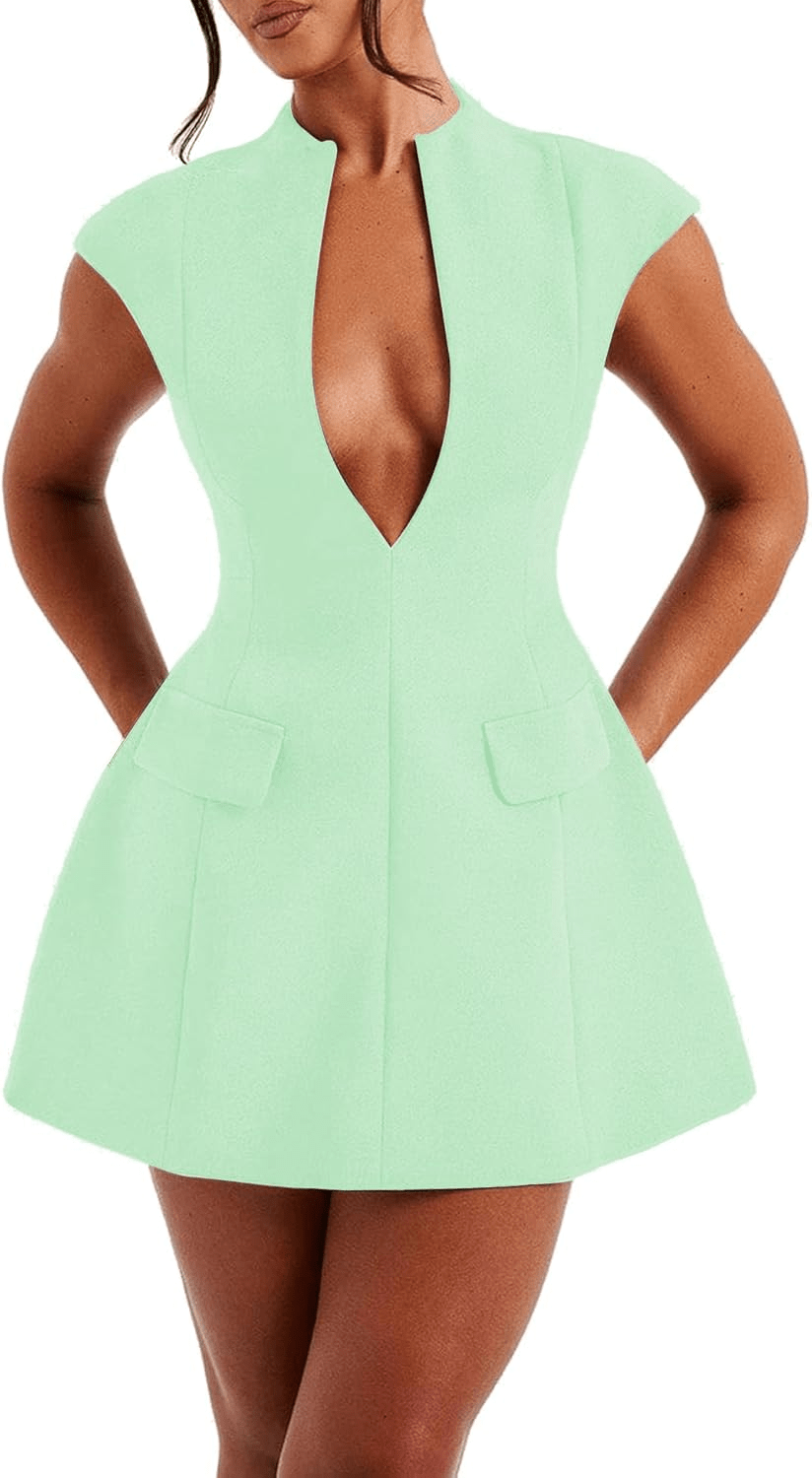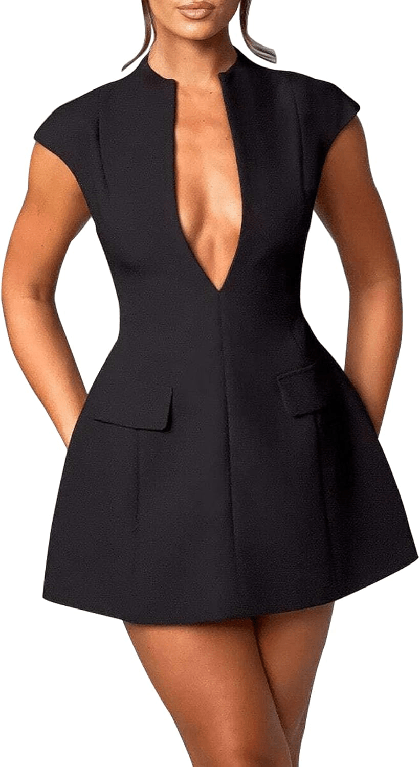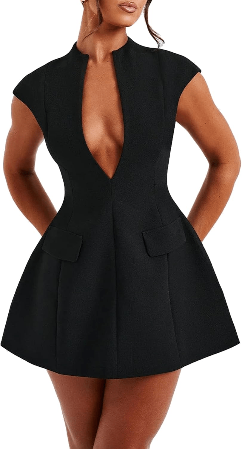 Women’s Cap Sleeve Deep V-Neck Mini Dress – Zipper Front, Hollow Out, A-Line Bodycon Fit | Sexy Summer Party Look | Now on Brundo.net