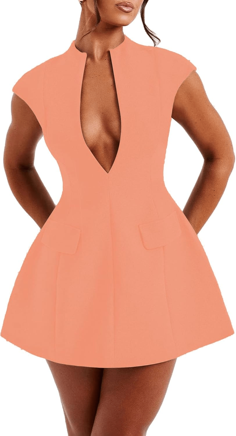 Women’S Summer Sexy Cap Sleeve Deep V Neck Zipper A-Line Mini Dress Hollow Bodycon Night Out Party Dress